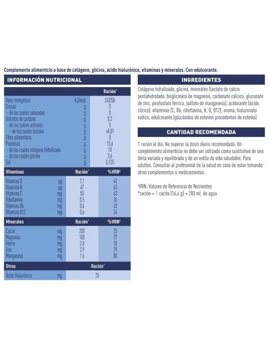 Colágeno hidrolizado, glicina, minerales (lactato de calcio pentahidratado, bisglicinato de magnesio, carbonato cálcico, gluconato de zinc, pirofosfato férrico, sulfato de manganeso), acidulante (ácido cítrico), vitaminas (C, B6, riboflavina, K, D, B12), aroma, hialuronato sódico, edulcorante (glucósidos de esteviol procedentes de estevia).