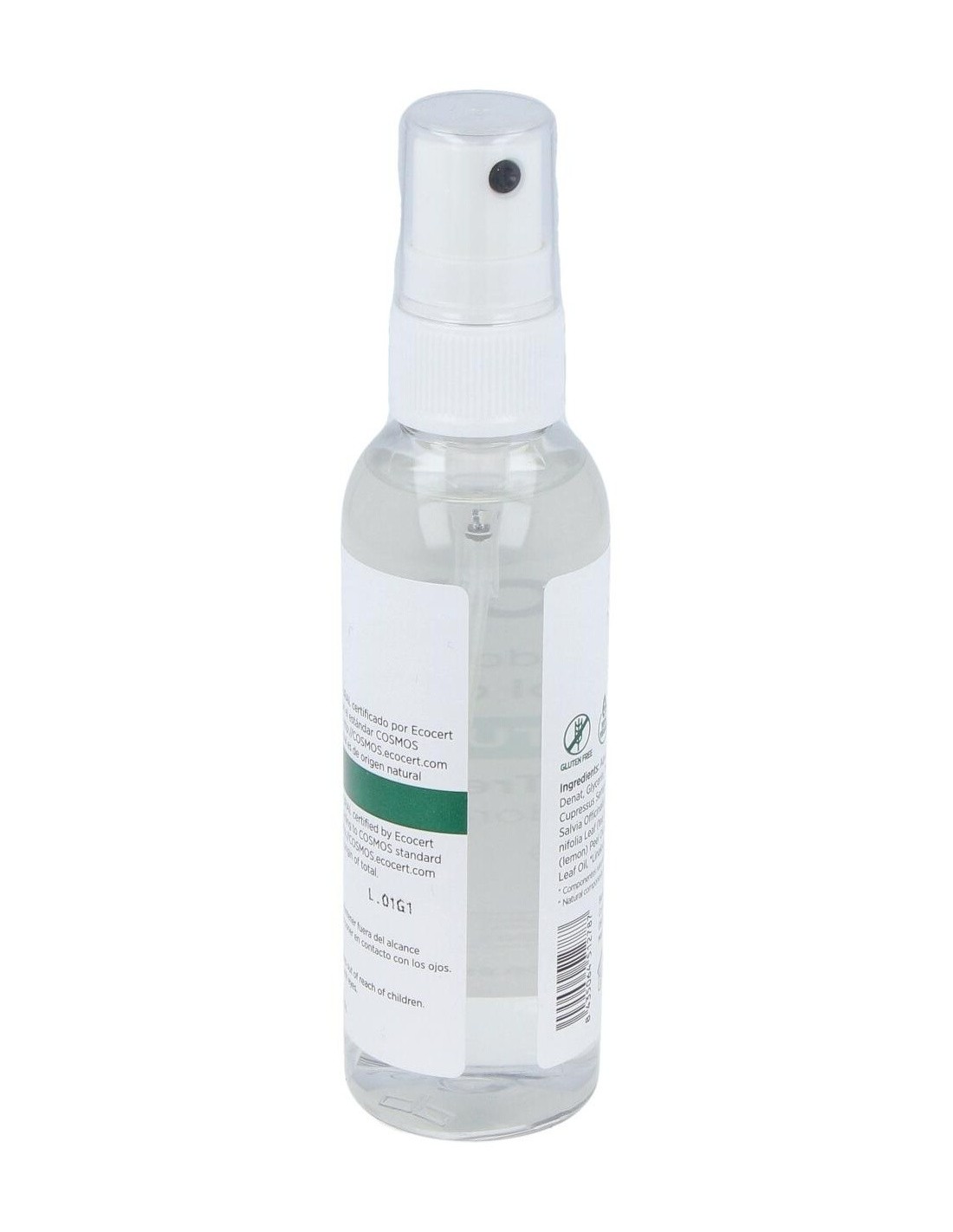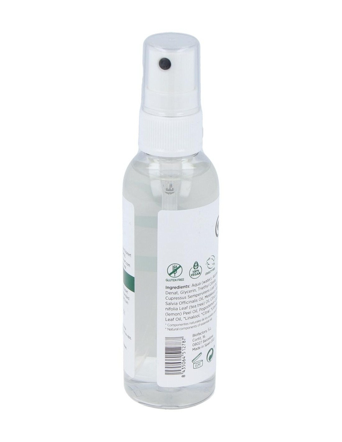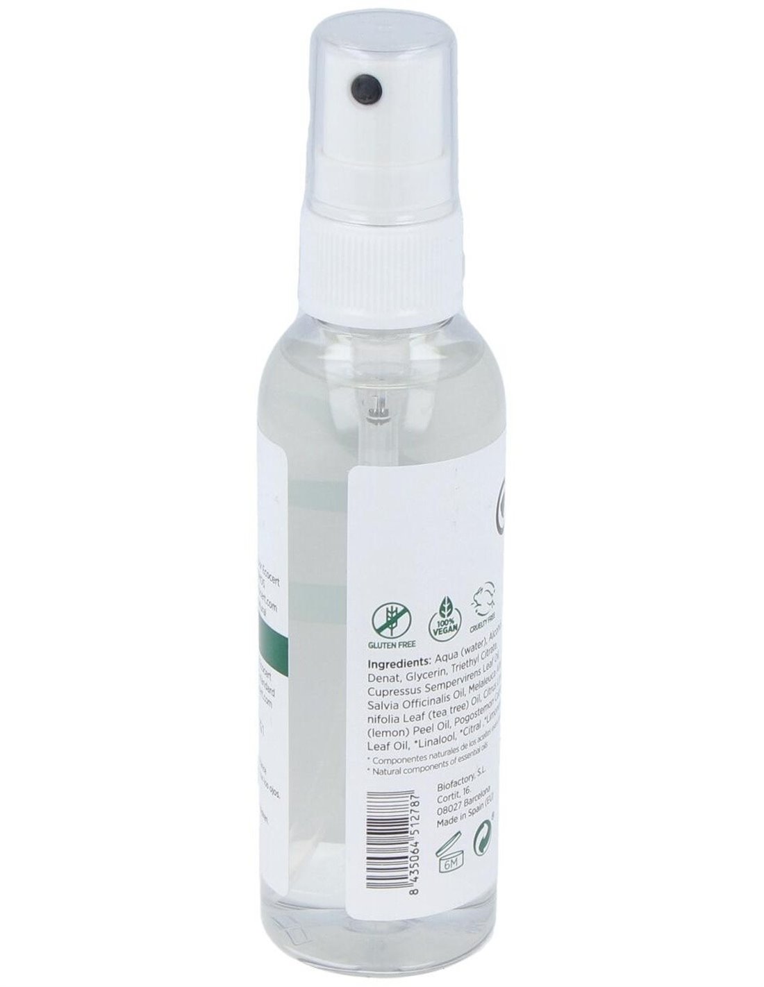 Aqua (water), Alcohol Denat, Glycerin Triethyl Citrate,Cupressus Sempervirens Leaf Oil, Salvia Offiinalis Oil, Melaleuca Alternifolia Leaf (tea tree) Oil, Citrus Limon (lemon) Peel Oil, Pogostemon Cablin Leaf Oil, *Linalool, *Citral ,*Limonene.
