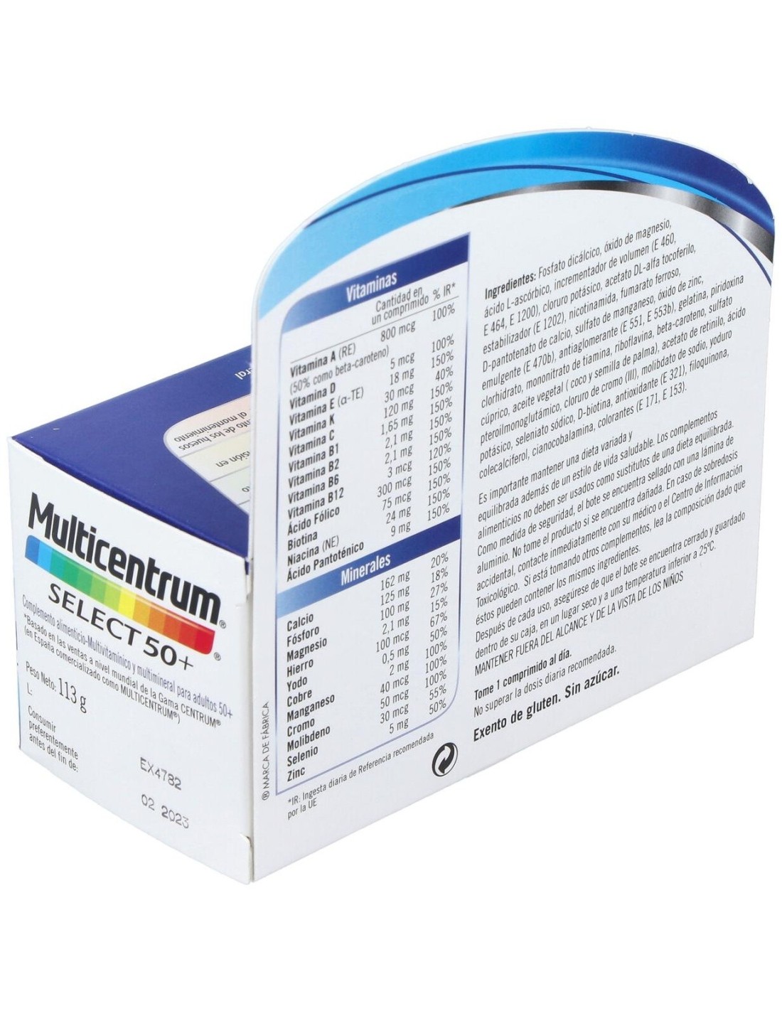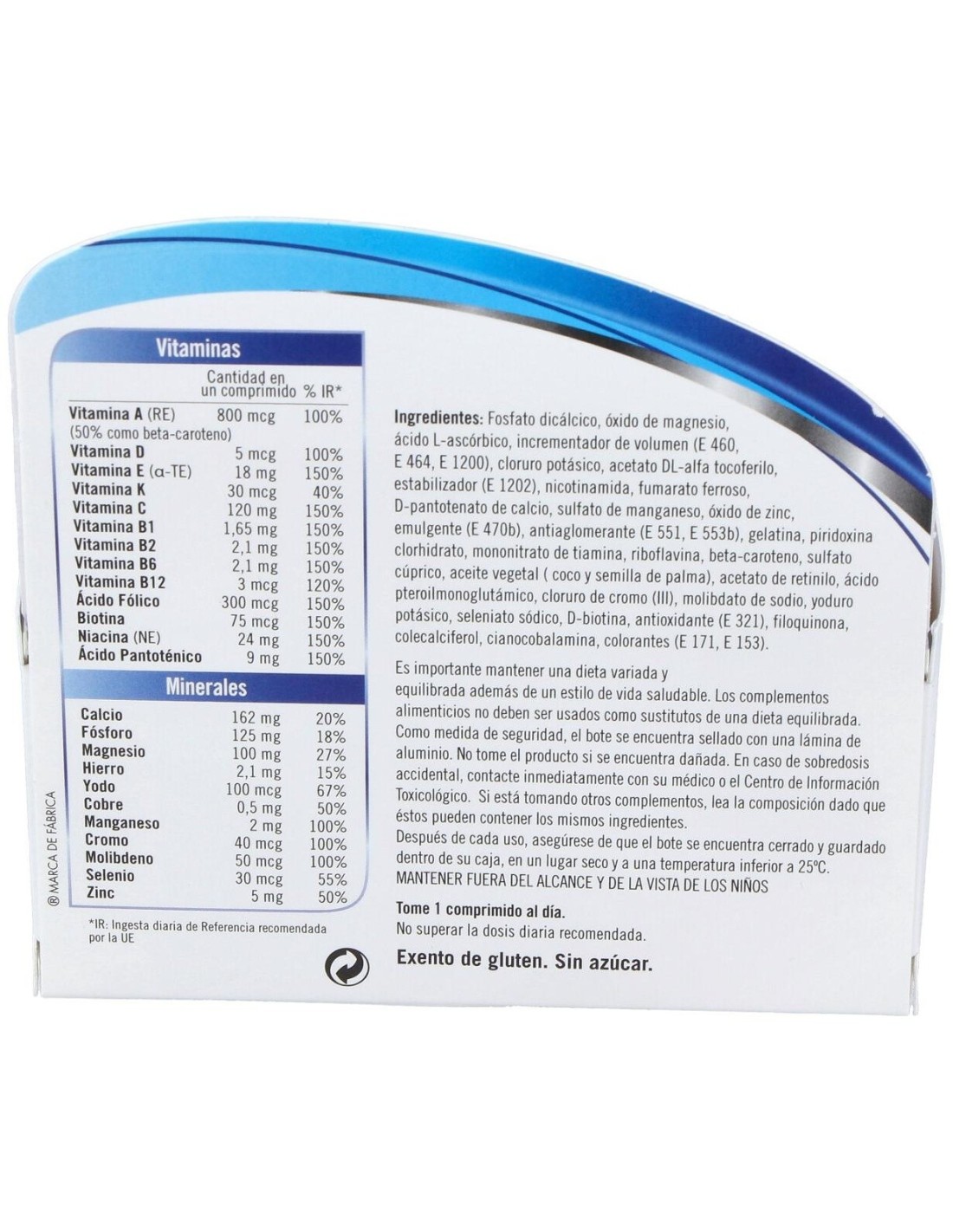 Fosfato dicálcico, óxido de magnesio, ácido L-ascórbico, incrementador de volumen (E 460, E 464, E 1200), cloruro potásico, acetato DL-alfa tocoferilo, estabilizador (E 1202), nicotinamida, fumarato ferroso, D-pantotenato de calcio, sulfato de manganeso, óxido de zinc, emulgente (E 470b), antiaglomerante (E 551, E 553b), gelatina, piridoxina clorhidrato, mononitrato de tiamina, riboflavina, beta-caroteno, sulfato cúprico, aceite vegetal ( coco y semilla de palma), acetato de retinilo, ácido pteroilmonoglutámico, cloruro de cromo (III), molibdato de sodio, yoduro potásico, seleniato sódico, D-biotina, antioxidante (E 321), filoquinona, colecalciferol, cianocobalamina, colorantes (E 171, E 153).