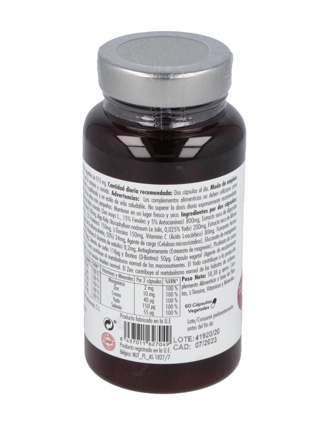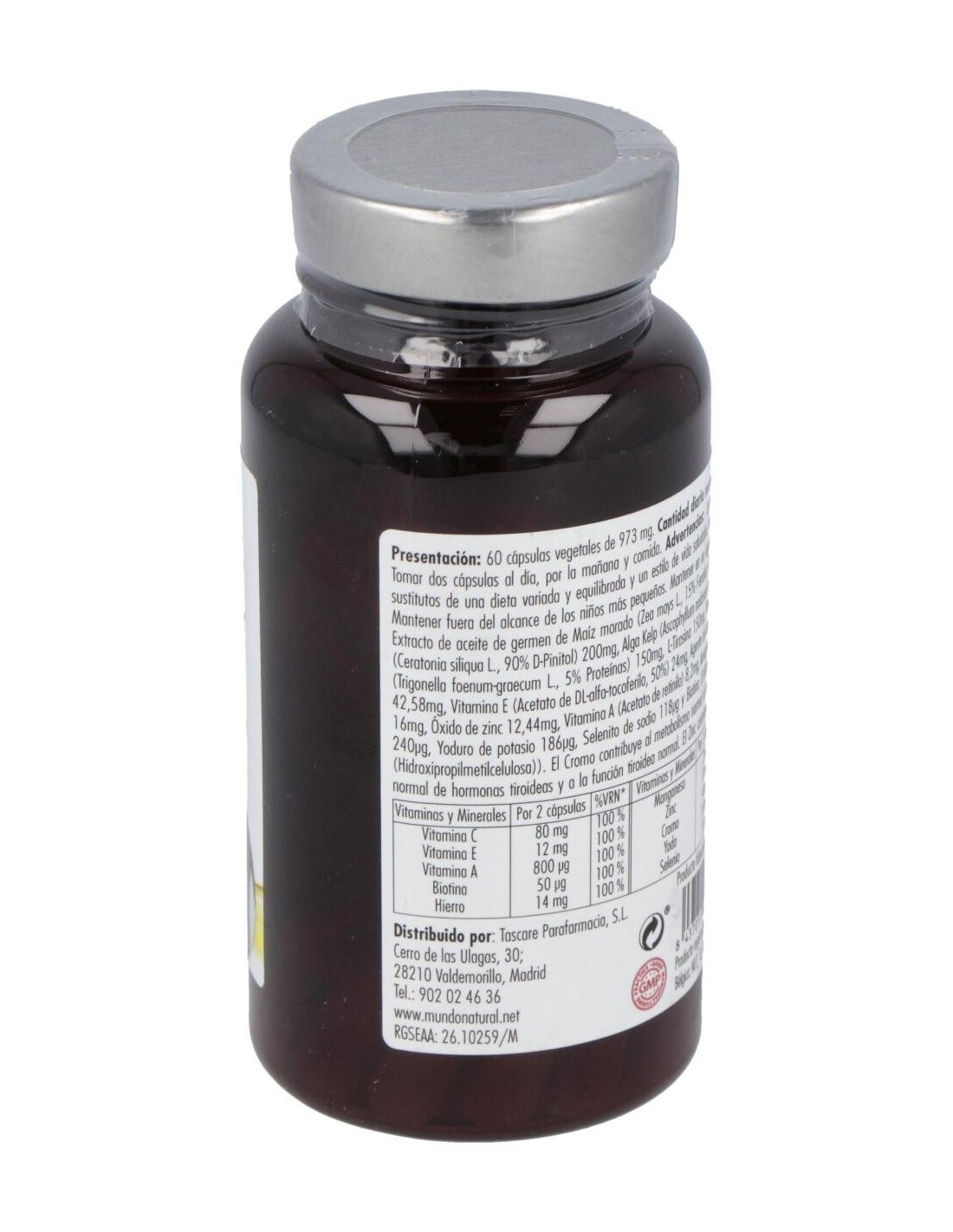 Complemento alimenticio a base de extractos de plantas, vitaminas y minerales. El cromo contribuye al metabolismo normal de los macronutrientes. El Yodo contribuye a la producción normal de hormonas tiroideas y a la función tiroidea normal. El Zinc contribuye al metabolismo normal de los hidratos de carbono. Ayuda a mantener un peso saludable.