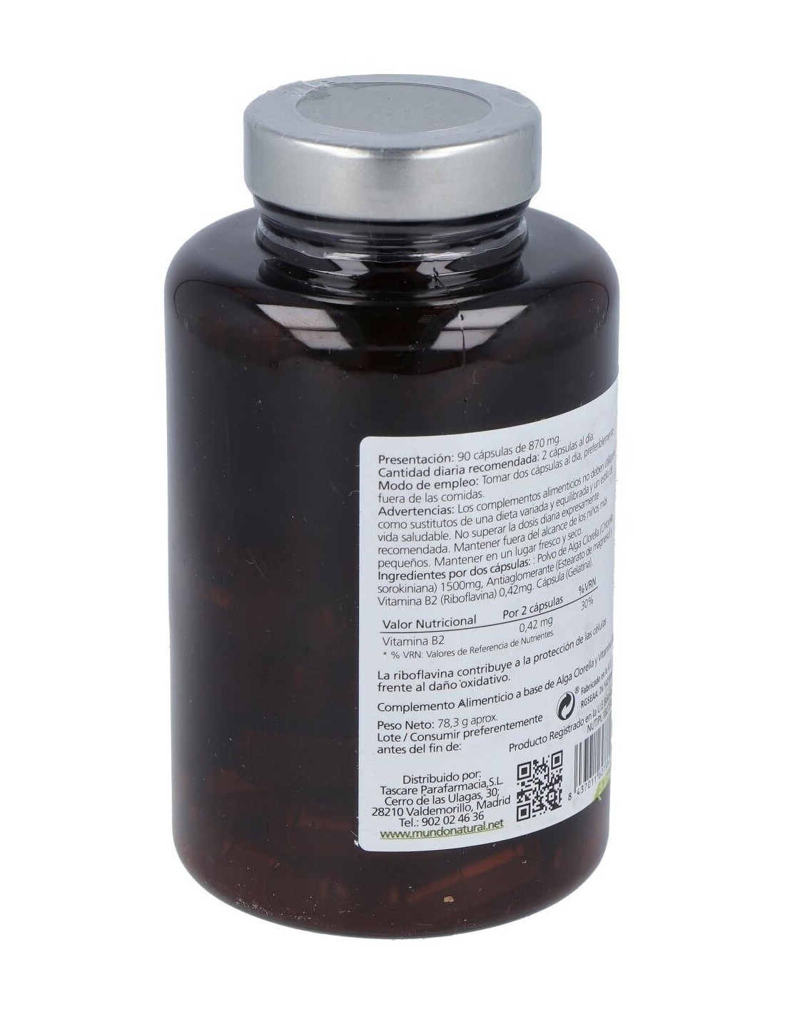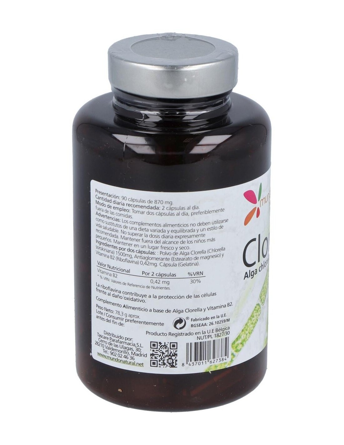 Por 2 cápsulas: Polvo de Alga Clorela (Chlorella sorokiniana): 1500 mg, Vitamina B2 (Riboflavina): 0,42 mg, Antiaglomerante (Estearato de magnesio), Cápsula (Gelatina).