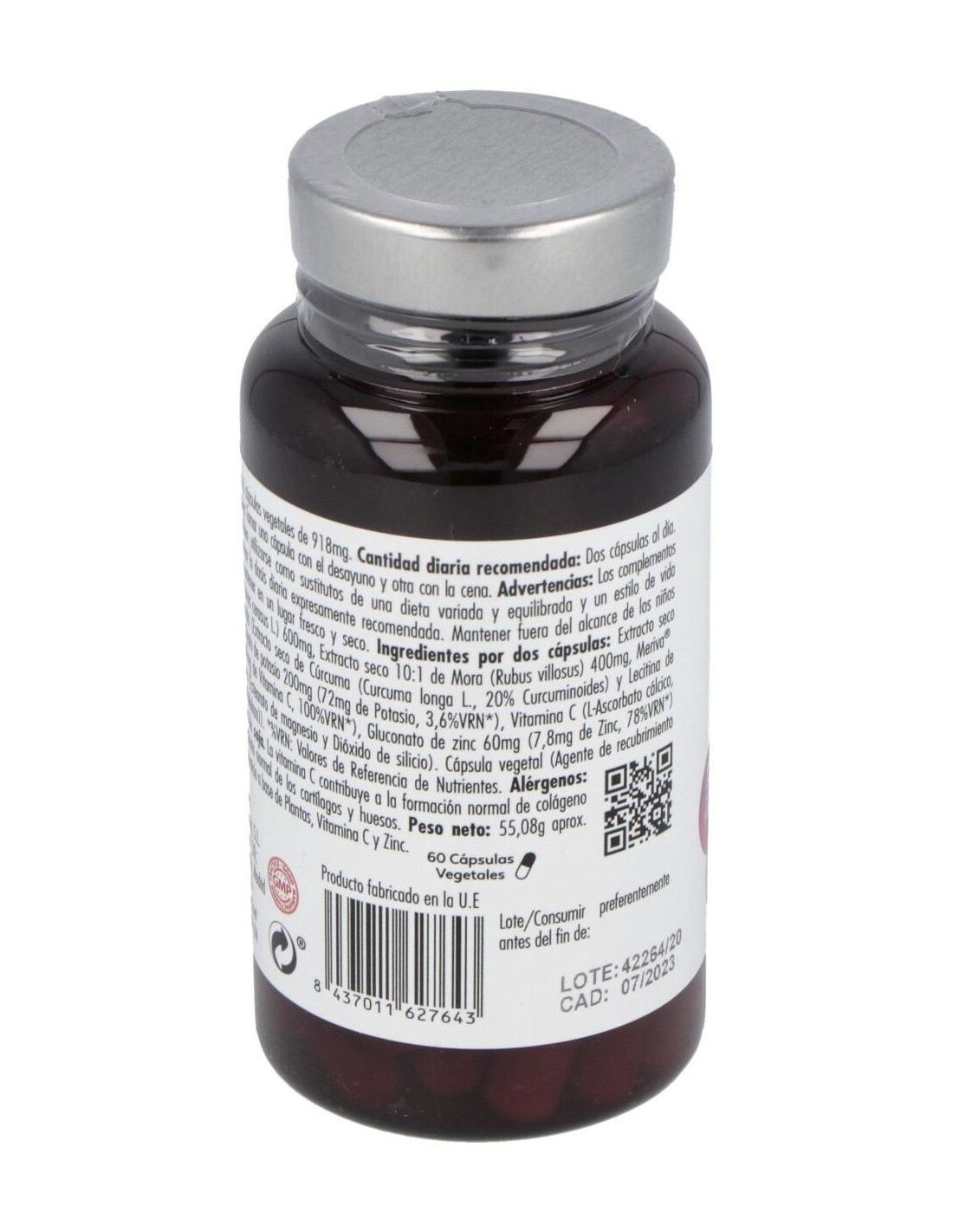 Ingredientes por dos cápsulas: Extracto seco 4:1 de Cereza (Prunus ceraseus L.) 600 mg, Extracto seco 10:1 de Mora (Rubus villosus) 400 mg, Meriva (Cúrcuma fitosomada) (Extracto seco de Cúrcuma (Cúrcuma Longa L.) 20% curcuminoides) y Lecitina de Soja 200 mg, Citrato de Potasio 200 mg (72 mg de Potasio, 3,6%VRN*), Vitamina C (L-Ascorbato de cálcico, 80%) 100 mg (80mg de Vitamina C 100%VRN), Gluconato de zinc 60 mg (7,8 mg de Zinc, 78%VRN) y Antiaglomerantes (estearato de magnesio y Dióxido de Silicio). Cápsula vegetal (Agente de recubrimiento (Hidroxipropilmetilcelulosa). *%VRN: Valores de Referencia de Nutrientes.