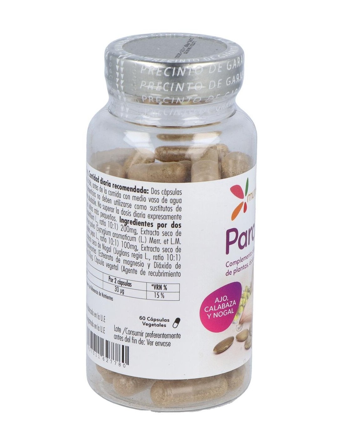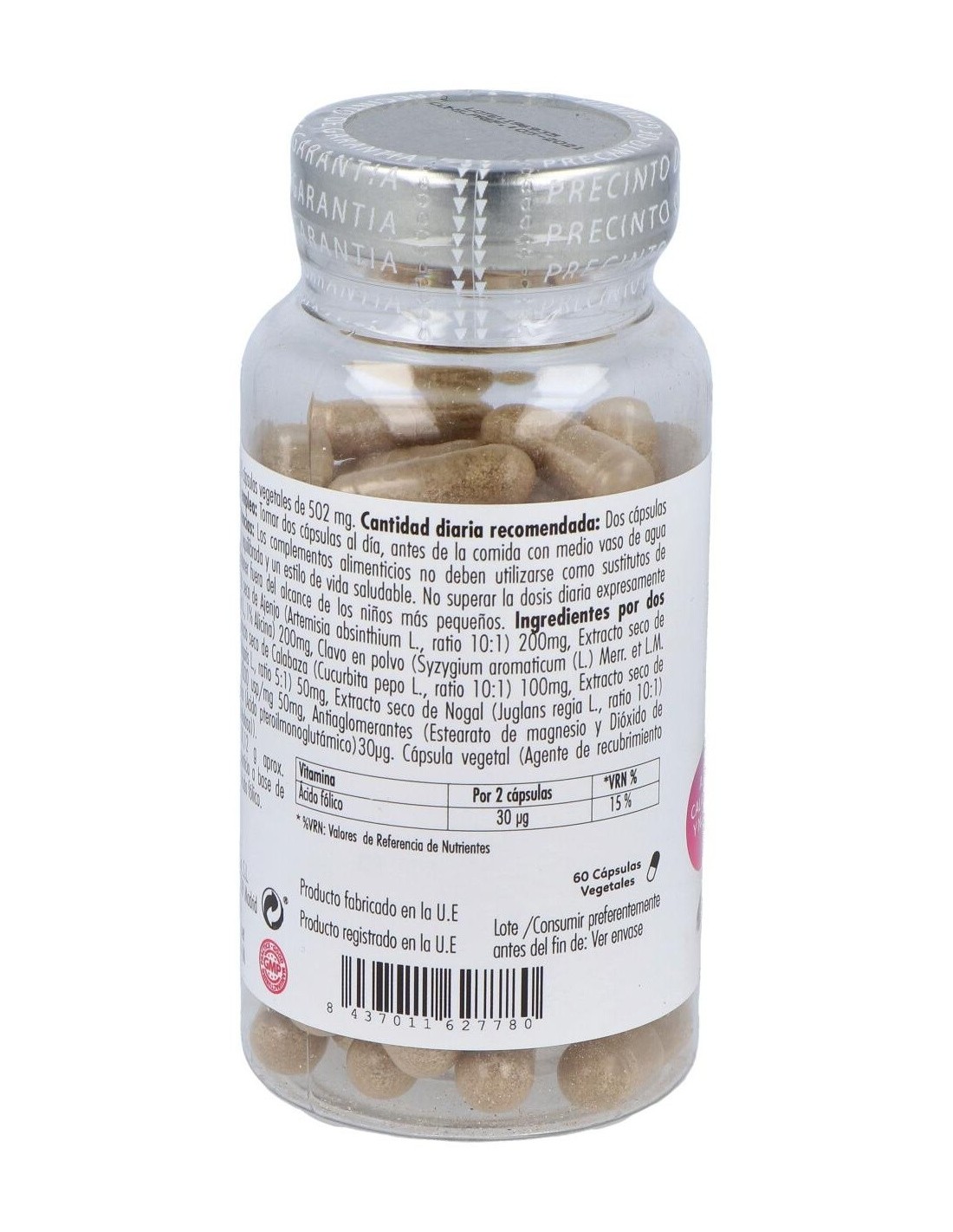 Ingredientes por dos cápsulas: Extracto seco de Ajenjo (Artemisia absinthium L., ratio 10:1) 200mg, Extracto seco de Ajo (Allium sativum L., 1% Alicina) 200mg, Clavo en polvo (Syzygium aromaticum (L.) Merr. et L.M. Perry) 100mg, Extracto seco de Calabaza (Cucurbita pepo L., ratio 10:1) 100mg, Extracto seco de Tomillo (Thymus vulgaris L., ratio 5:1) 50mg, Extracto seco de Nogal (Juglans regia L., ratio 10:1) 50mg, Papaína >6000 usp/mg 50mg, Antiaglomerantes (Estearato de magnesio y Dióxido de silicio) y Ácido fólico (Ácido pteroilmonoglutámico) 30µg (15% *VRN). Cápsula vegetal (Agente de recubrimiento (Hidroxipropilmetilcelulosa) y Colorante (Concentrado de espirulina)).