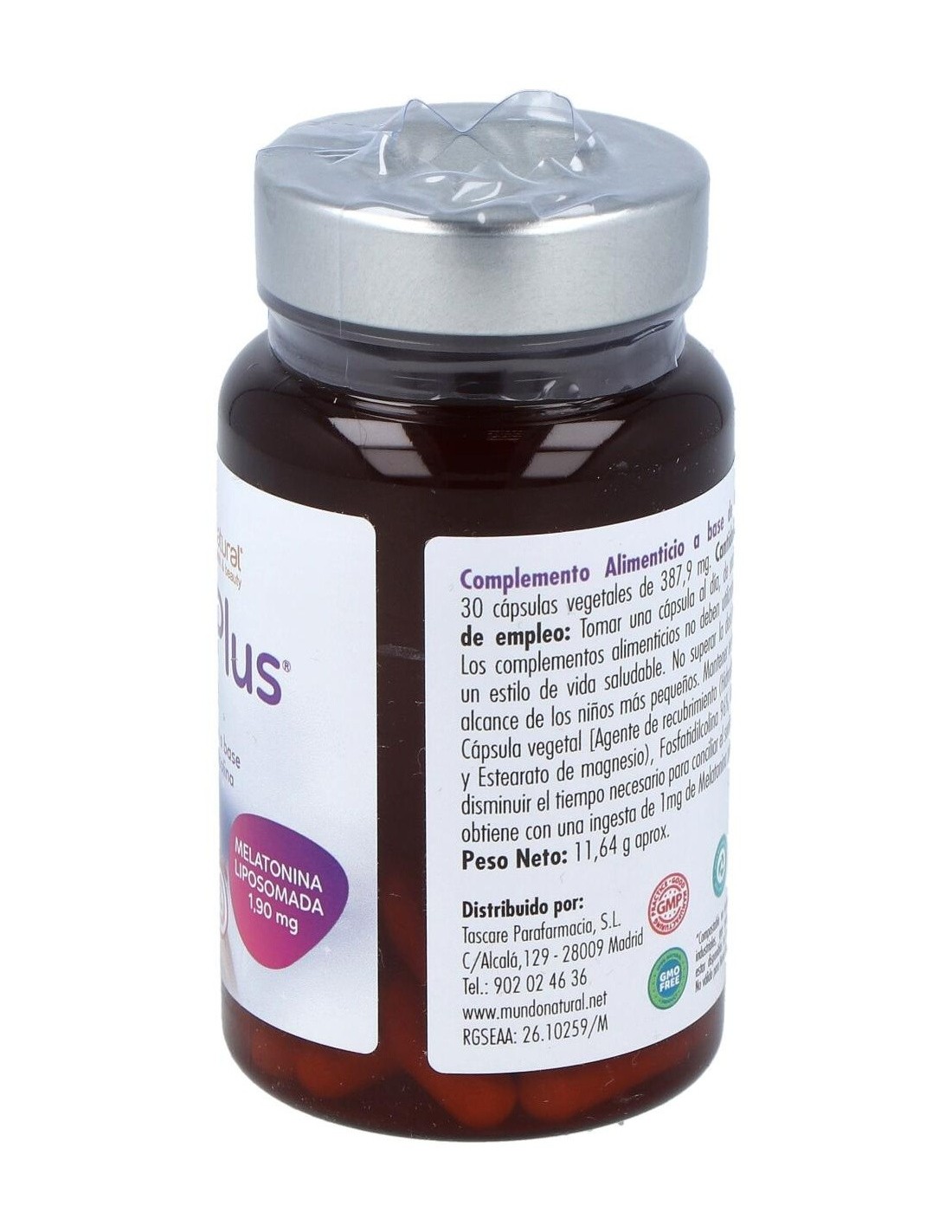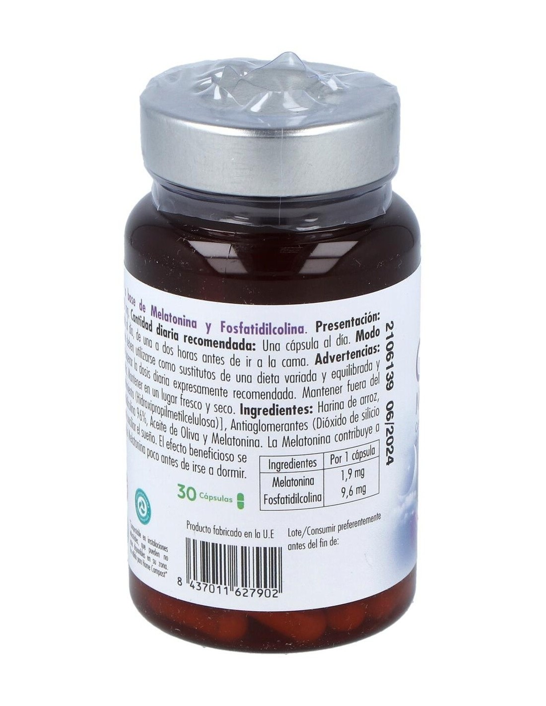 Harina de arroz, Antiaglomerantes (Dióxido de silicio y Estearato de magnesio), Fosfatidilcolina 96%, Aceite de Oliva y Melatonina. Cápsula vegetal (Agente de recubrimiento (Hidroxipropilmetilcelulosa))
