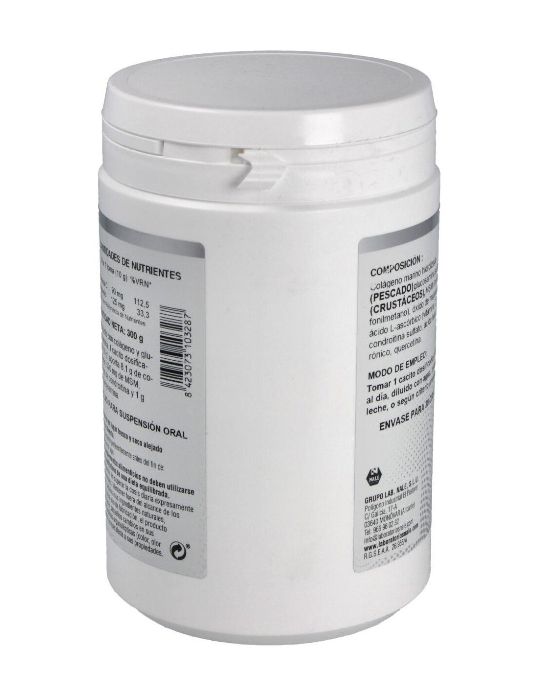 Colágeno marino hidrolizado, glucosamina sulfato, MSM (metilsulfonilmetano), carbonato de magnésio, ácido L-ascórbico (vitamina C), condroitina sulfato, ácido hialurónico, quercetina.