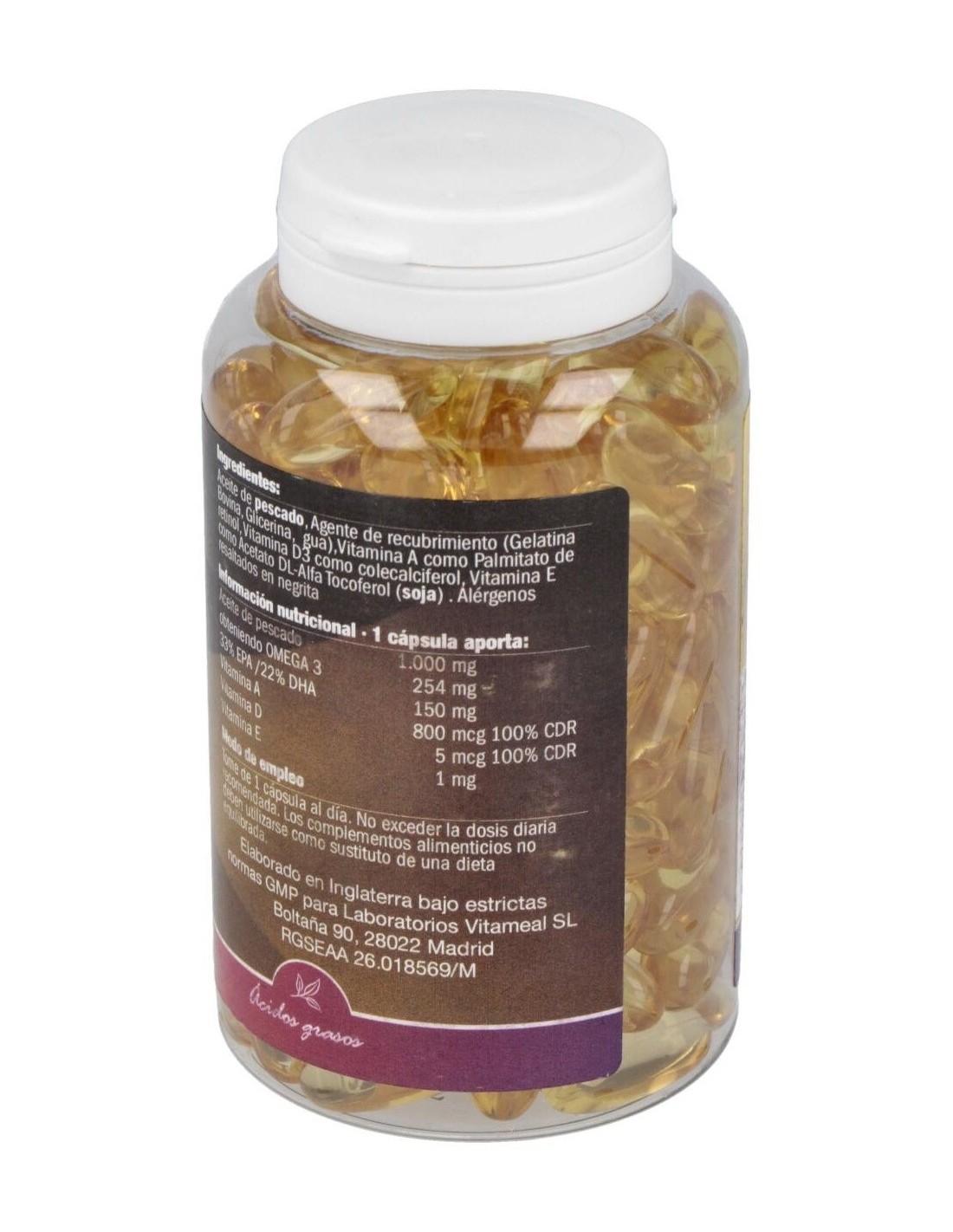 Cápsulas de aceite de pescado obtenido de atún, salmón, fletán, caballa y bacalao procedentes del Atlántico Sur, rico en omega 3, grasa necesaria para el fortalecimiento de las neuronas y demás funciones del organismo. Además favorecen la salud cardiovascular, reduciendo el riesgo de sufrir afecciones relacionadas con el corazón.