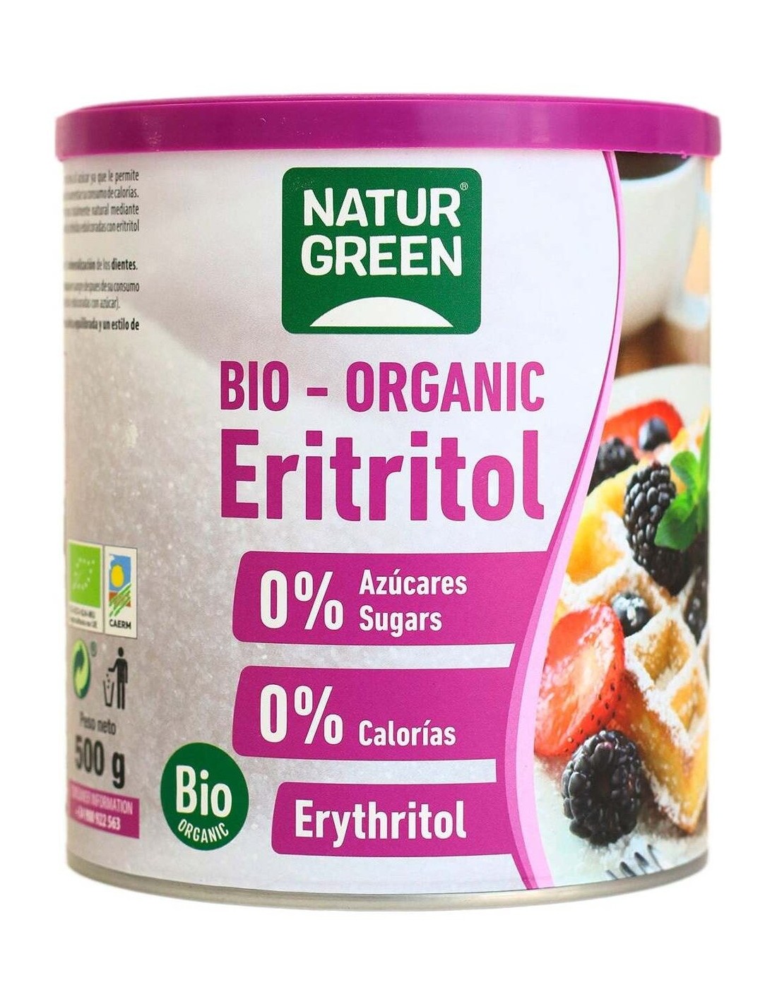 NATURGREENEdulcorante de mesa a base de eritritol ecológico. 100% vegetal Sin lactosa, Bajo contenido en sal, Bajo índice glucémico, Bio, Sin azúcares, Sin gluten, Sin huevo, Sin proteína láctea.
