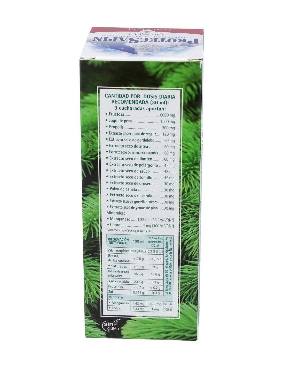 Agua, estabilizante glicerol, fructosa, jugo de pera (Pyrus communis L.), própolis, aroma de hierbas, extracto glicerinado de raíz de regaliz (Glycyrrhiza glabra L.), extracto seco de flores de gordolobo (Verbascum thapsus), extracto seco de raíz de altea (Althaea officinalis L.), extracto seco de raíz de echinácea (Echinacea purpurea L. Moench), extracto seco de flores de llantén (Plantago lanceolata L.), extracto seco de raíz de pelargonio (Pelargonium sidoides DC.) (ratio 10:1), estabilizante goma xantana, conservador sorbato potásico, extracto seco de flores de saúco (Sambucus nigra L.), extracto seco de flores de tomillo (Thymus serpyllum L.), extracto seco de partes aéreas de drosera (Drosera rotundifolia L.), polvo de corteza de canela (Cinnamomum zeylanicum), extracto seco de frutos de acerola (Malpighia punicifolia L.), extracto seco de hojas de grosellero negro (Ribes nigrum L.), extracto seco de yemas de pino (Pinus sylvestris), gluconato de manganeso, aromas de mentol y eucaliptol, gluconato de cobre, conservador benzoato de sodio.