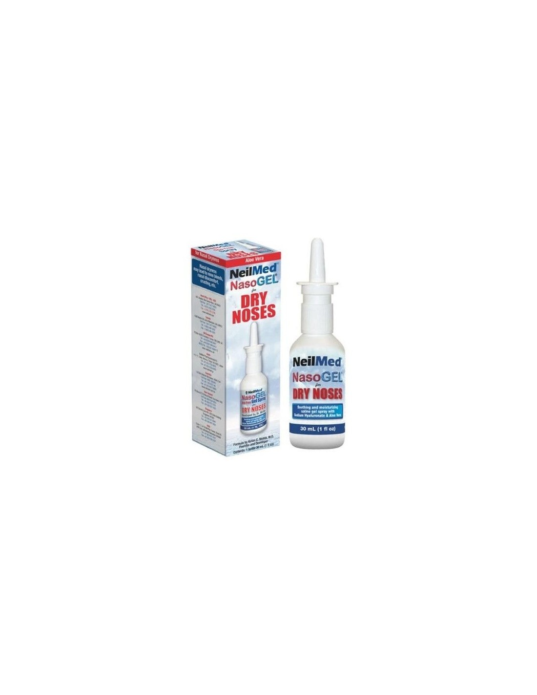 NEILMEDNasoGel® Spray Gel es un gel nasal en base a una solución salina libre de fármacos formulado con hialuronato de sodio para proporcionar humedad nasal. NasoGEL® proporciona la humedad para hidratar y lubricar los conductos nasales secos e irritados causados por el clima seco y calor interior. Ayuda a reducir la sequedad nasal ocasionada durante los viajes aéreos, el oxígeno y el uso de CPAP, así como los síntomas de sequedad causada por la rinitis atrófica, la radioterapia post operatoria y la cirugía de los senos sinusales.