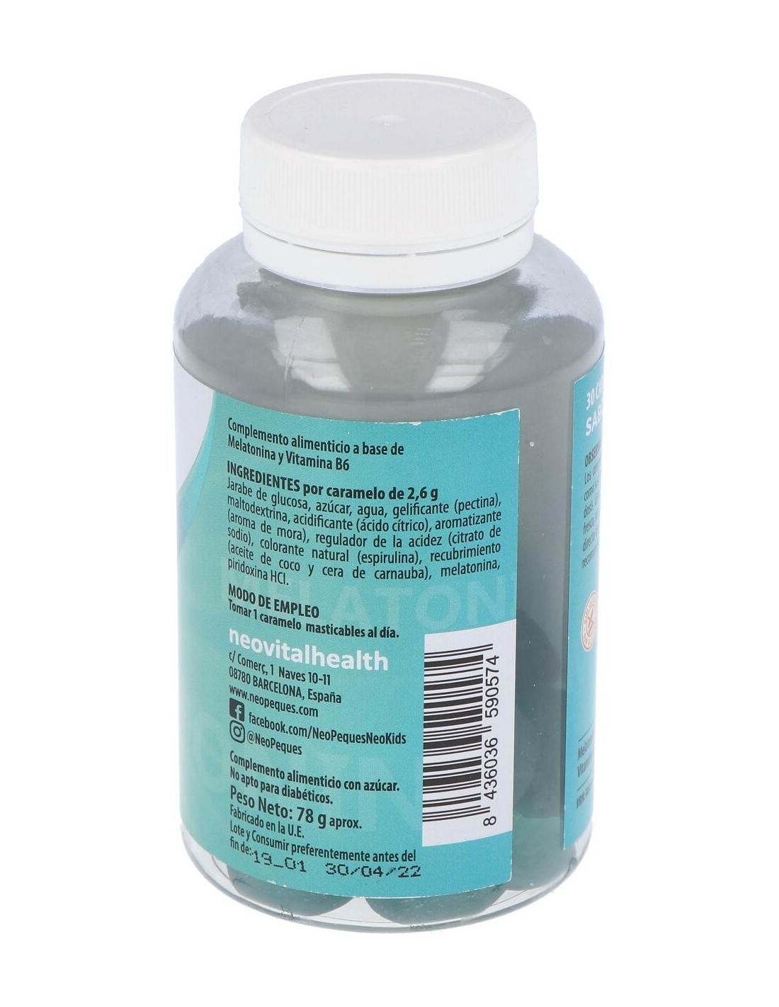 Suplemento alimenticio para niños. Ayuda naturalmente a descansar de manera continuada y tranquila. Este producto de Neo Peques se presenta en comprimidos masticables de formato ovalado y con un atractivo sabor a mora: ¡a los peques les encanta tomarlos! Estas gominolas carecen de derivados lácteos y de gluten. Cuentan, eso sí, con azúcar, por lo que no son aptos para los diabéticos. Al estar elaboradas con melatonina y vitamina B6, su efecto resulta relajante y favorece un descanso reparador. Contribuyen a hacer el momento del descanso más agradable y divertido. Tomar la dosis apropiada se convierte en una rutina que invita al descanso. Además, favorece la conciliación del sueño diario y, gracias a ello, los niños despiertan más activos, serenos y relajados. Al descansar mejor, las defensas orgánicas también pueden salir reforzadas.