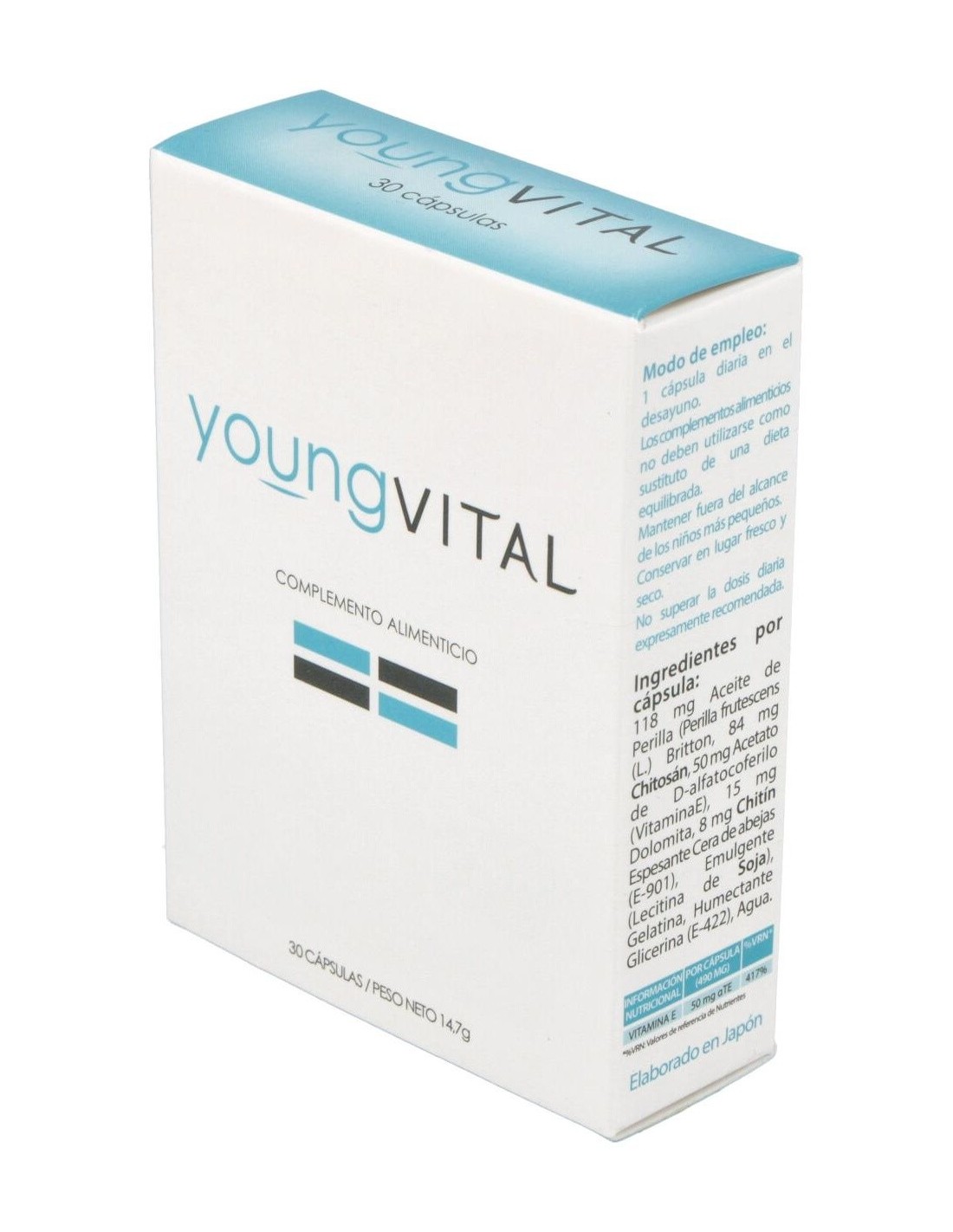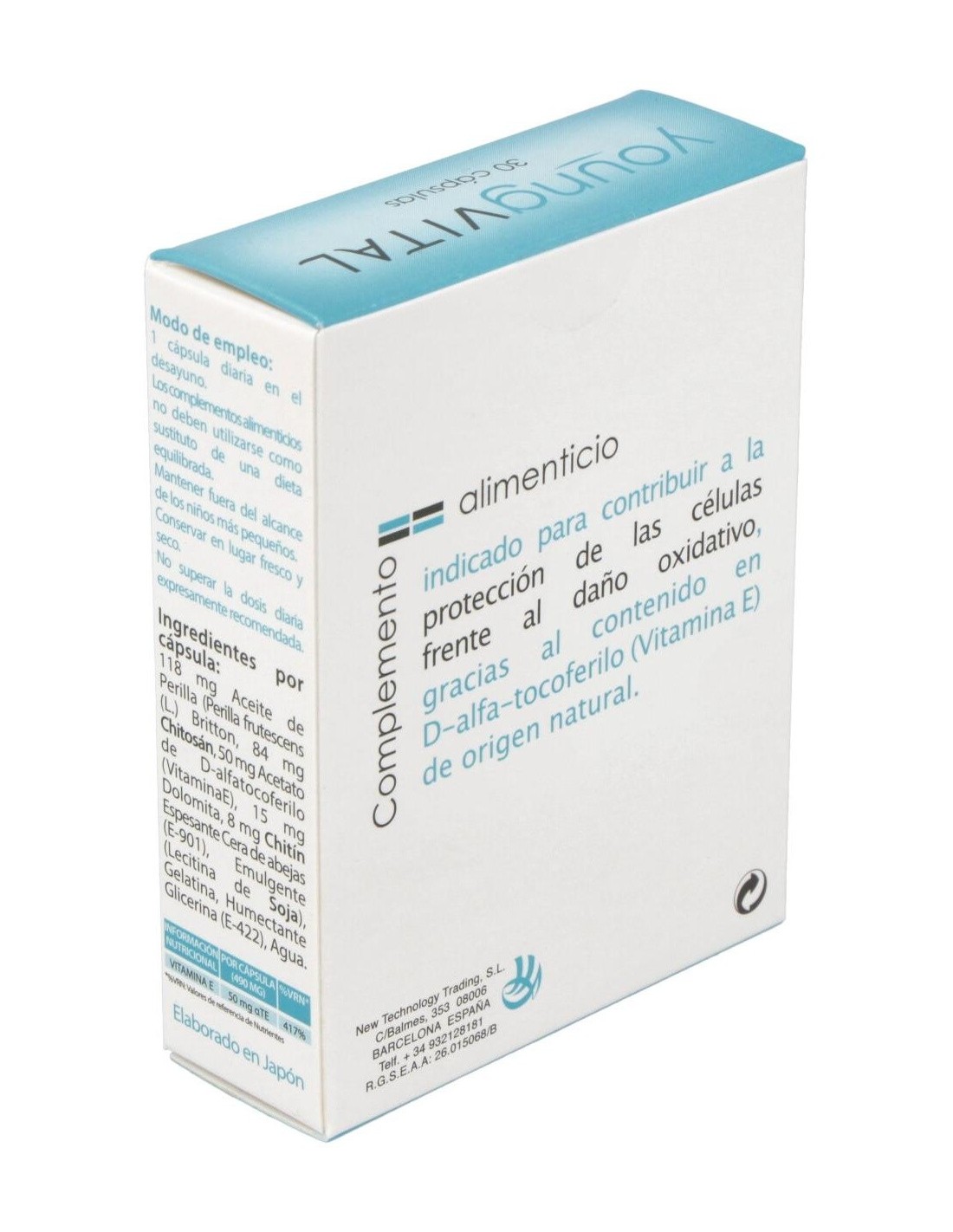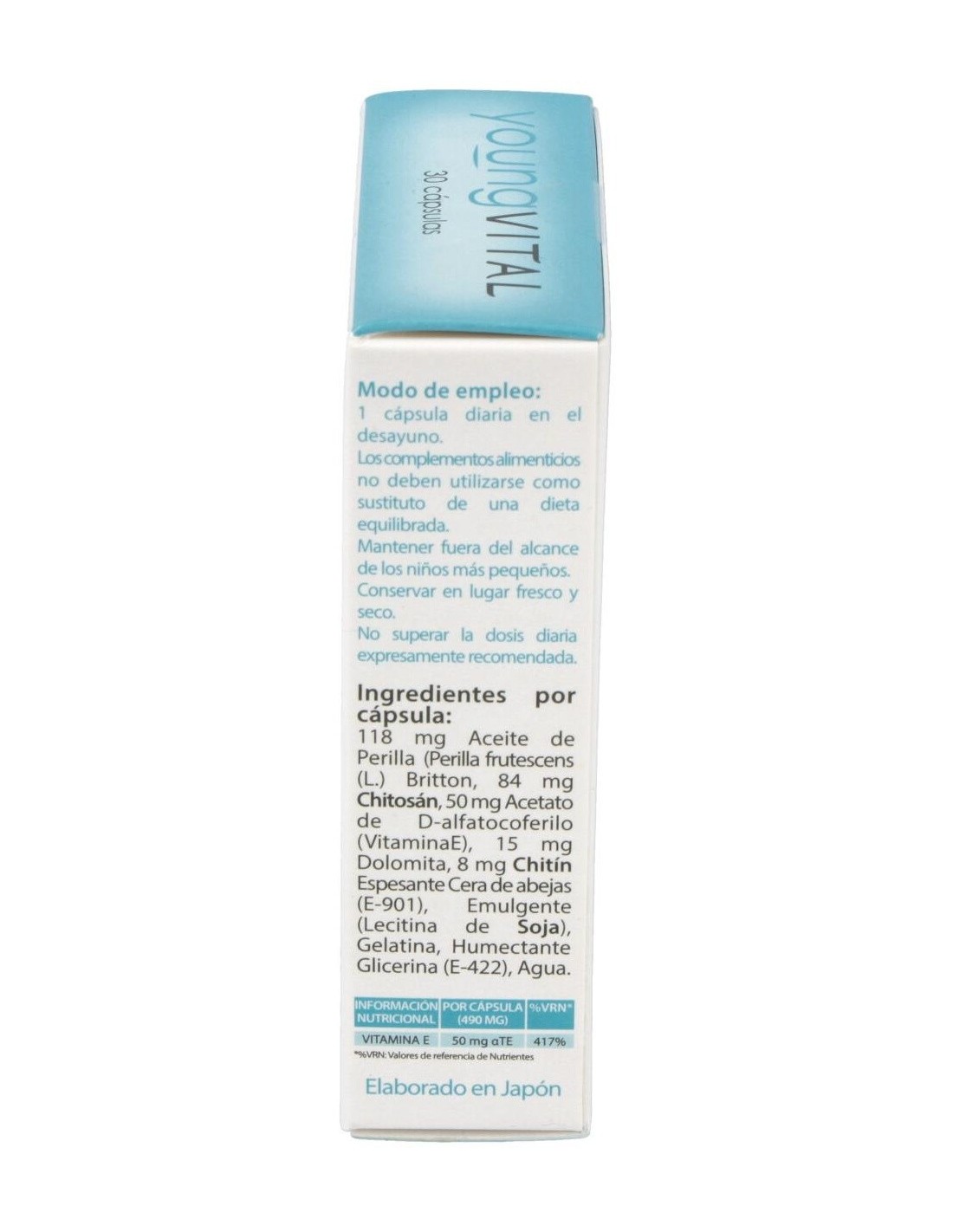 131.2 mg Aceite de Perilla (Perilla frutescens (L.) Britton), 84 mg Chitosán, Acetato de D-alpha-tocoferilo (26.9 mg Vitamina E, 224% CDR), 15 mg Dolomite, Espesante cera de abejas (E-901), Emulgente (Lecitina de Soja). Cobertura de la cápsula: Agente de recubrimiento (Gelatina), Humectante glicerina (E-422).
