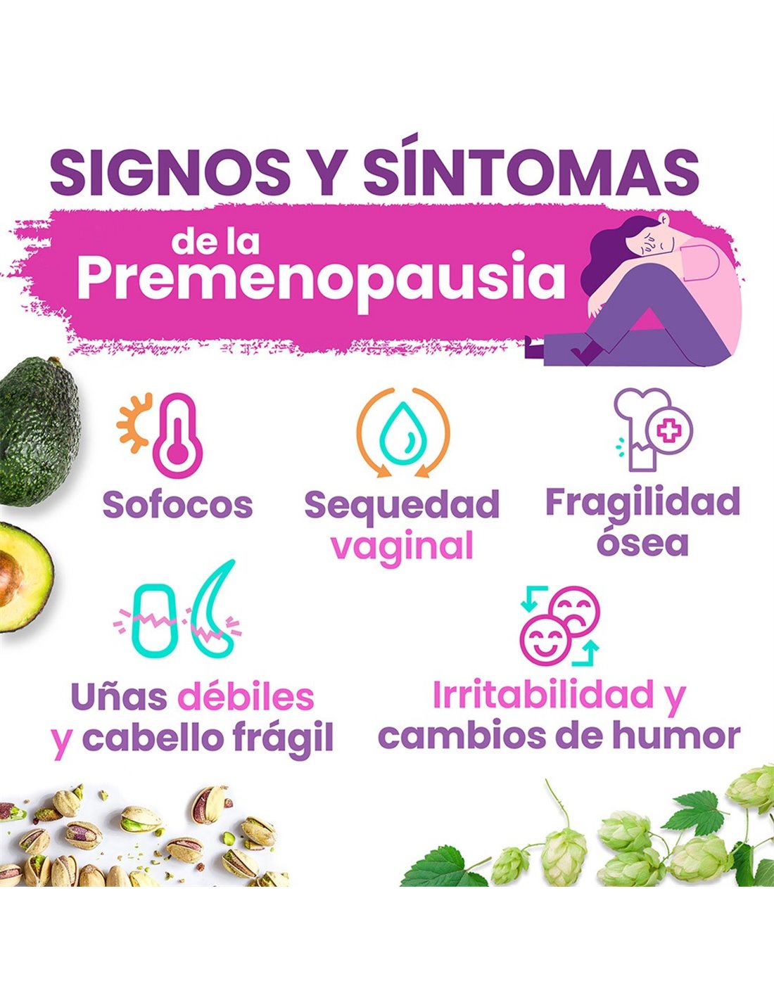 Sinergia a base de extracto seco de lúpulo y 12 vitaminas y minerales que ayudan a cubrir los requerimientos nutricionales de la mujer durante la menopausia y premenopausia.