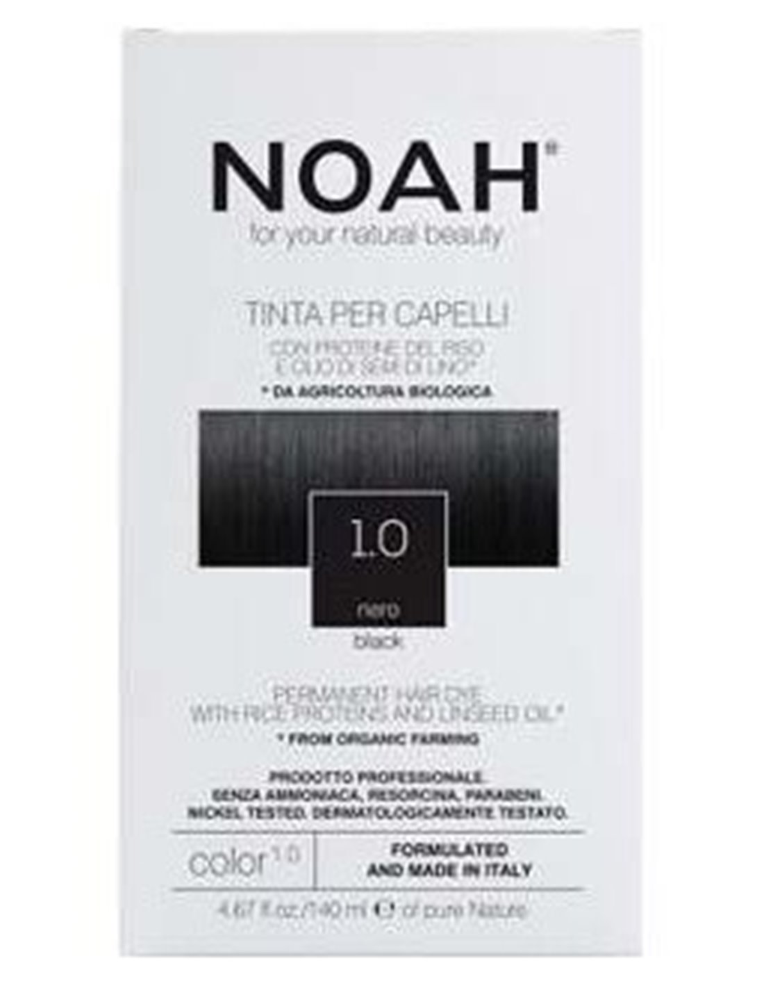 NOAHTinte con proteínas de arroz y aceite de linaza que aporta al cabello el color deseado y la cobertura de canas desde la primera aplicación, respetando al máximo el cuero cabelludo y la fibra capilar. La innovadora formulación no contiene amoníaco, parabenos y resorcinol en todos los matices, permite obtener el color deseado con total seguridad y practicidad y también es apto para pieles delicadas. Las proteínas de arroz y el aceite de linaza crean una película natural que protege el cabello, aportándole suavidad, cuerpo, elasticidad y brillo. La acción sinérgica con el champú Colore 1.6 realza el color prolongando su duración e intensidad y aporta al cabello hidratación, flexibilidad y resistencia a la rotura.\ \ El envase contiene: 1 tubo NOAH Hair coloración en crema (50ml monodosis), 1 bote NOAH Color Revealer (75ml monodosis), 1 folleto de instrucciones de uso, 1 par de guantes desechables, 1 NOAH Hair 1.6B Champú+ sobre Color Acondicionador Protection (dosis única de 15ml).