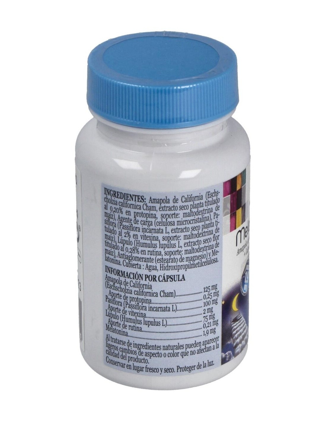 Amapola de California (e. s. titulado al 0,20% en protopina), Agente de carga (celulosa microcristalina), Pasiflora (e. s. titulado al 2% en vitexina), Lúpulo (e. s. titulado al 0,28% en rutina), Antiaglomerante (estearato de magnesio) y Melatonina (1,9 mg). Cubierta: Agua, Hidroxipropilmetilcelulosa.