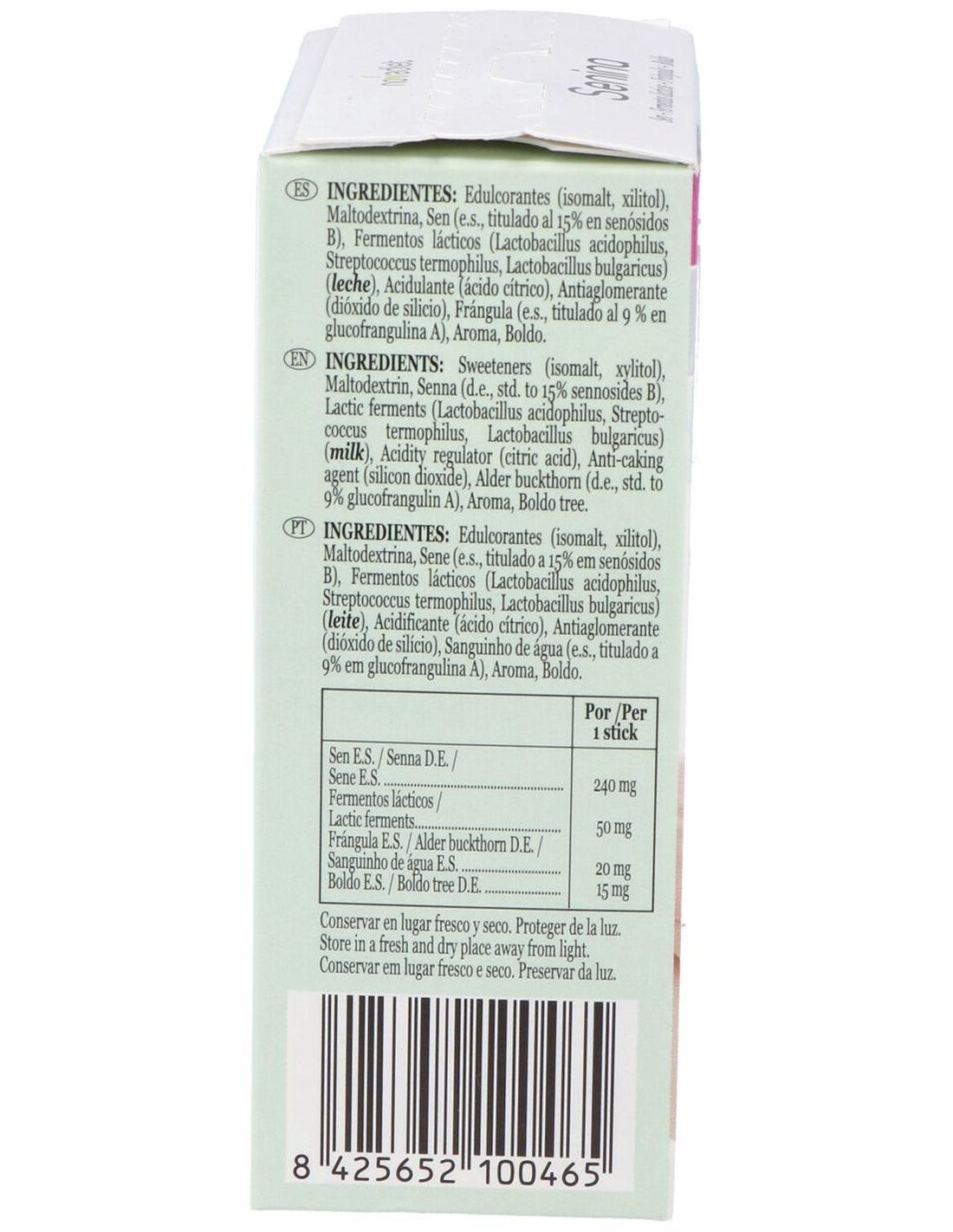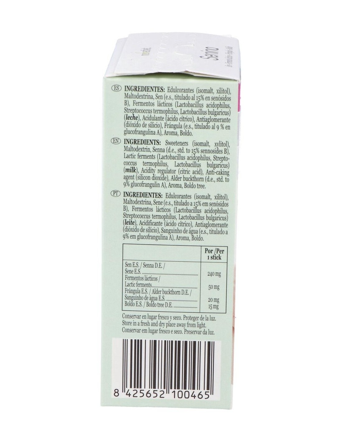Edulcorantes (isomalt, xilitol), Maltodextrina, Sen (e.s., titulado al 15% en senósidos B), Fermentos lácticos (Lactobacillus acidophilus, Streptoccus termophilus, Lactobacillus bulgaricus) (leche), Acidulante (ácido cítrico), Antiaglomerante (dióxido de silicio), Frángula (e.s., titulado al 9% en glucofrangulina A), Aroma, Boldo (e.s., titulado al 0,05% en boldina).
