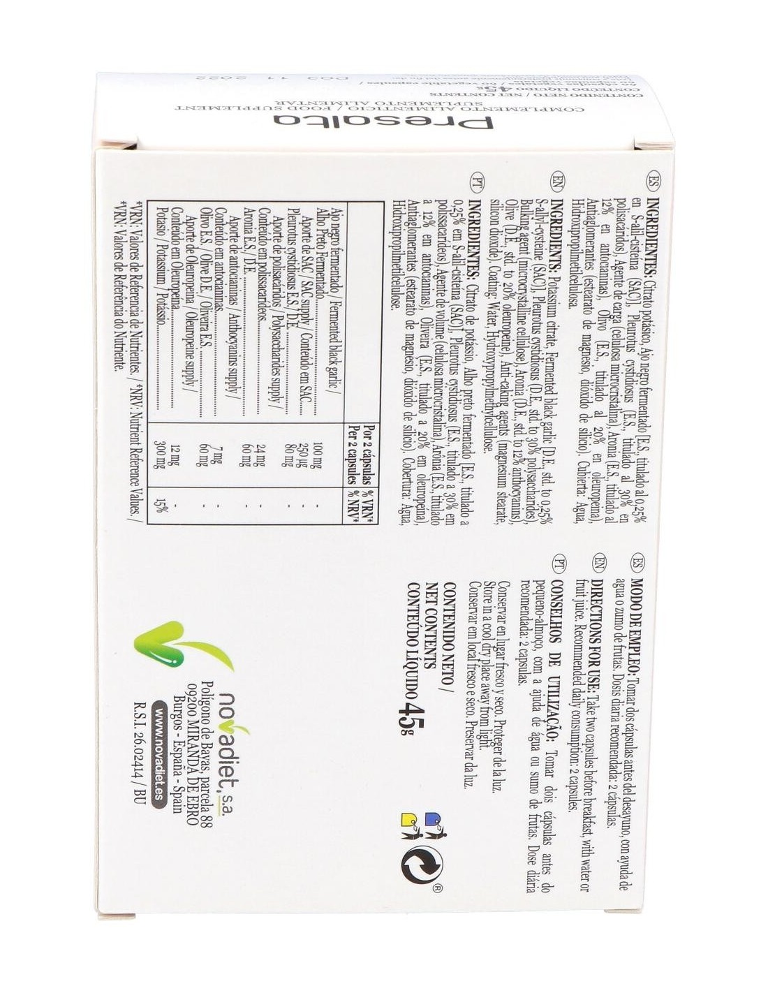 Citrato potásico, ajo negro fermentado (e.s titulado al 0,25% en SAC), pleurotus cystidiosus (e.s titulado al 30% en polisacáridos), agente de carga (celulosa microcristalina), aronia (e.s titulado al 12% en antocianinas), olivo (e.s titulado al 20% en oleuropeina), estearato de magnesio, dióxido de silicio, agua, hidroxipropilmetilcelulosa.