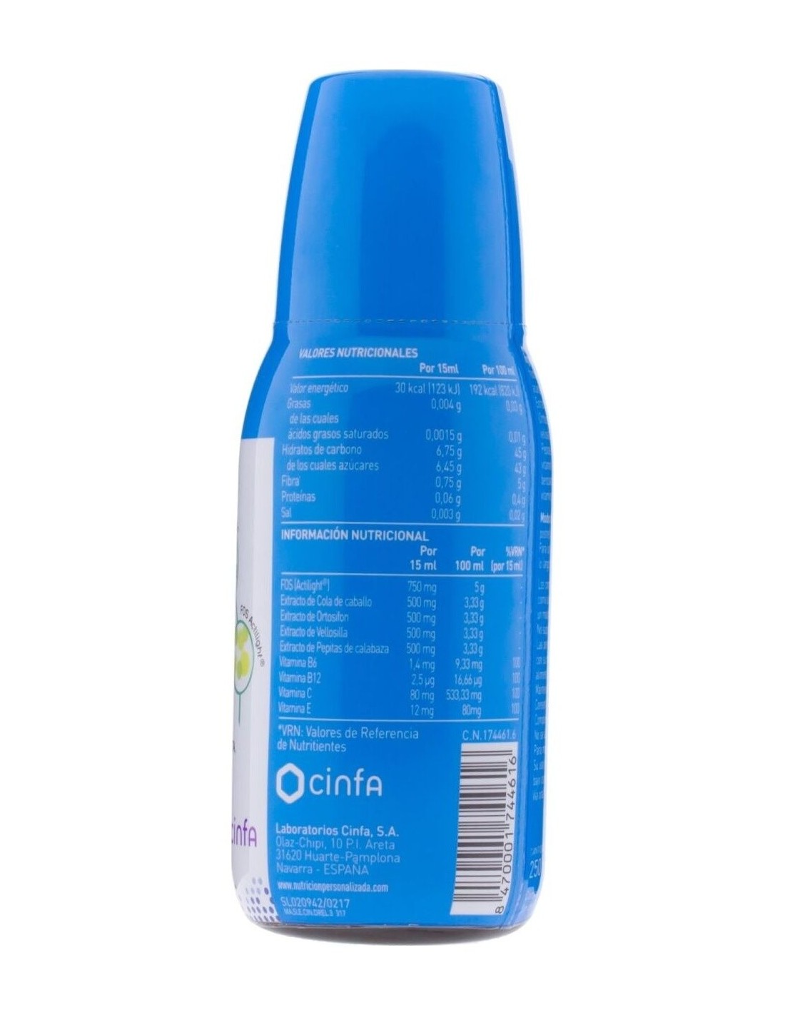 Por 100 ml:\ Jarabe de fructosa; fructooligosacaridos (5 g); aroma de pomelo; Extracto acuoso de Cola de Caballo (Equisetum arvense L.) (3,33 g); Extracto acuoso de Ortosifon (o té de java) (Orthosiphon stamineus Bentham) (3,33 g), Extracto acuoso de vellosilla (Hieracium pilosella L.) (3,33 g), Extracto acuoso de Pepitas de calabaza (Cucurbita pepo) (3,33 g); aroma de uva; vitamina C; conservantes: sorbato potásico (E-202), benzoato sódico (E-211); vitamina E; vitamina B6; vitamina B12.