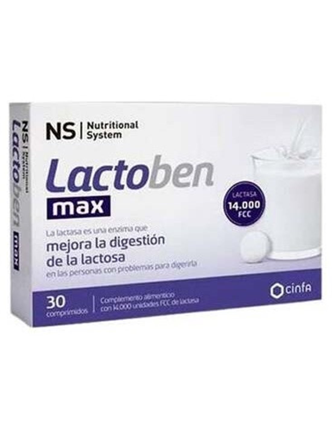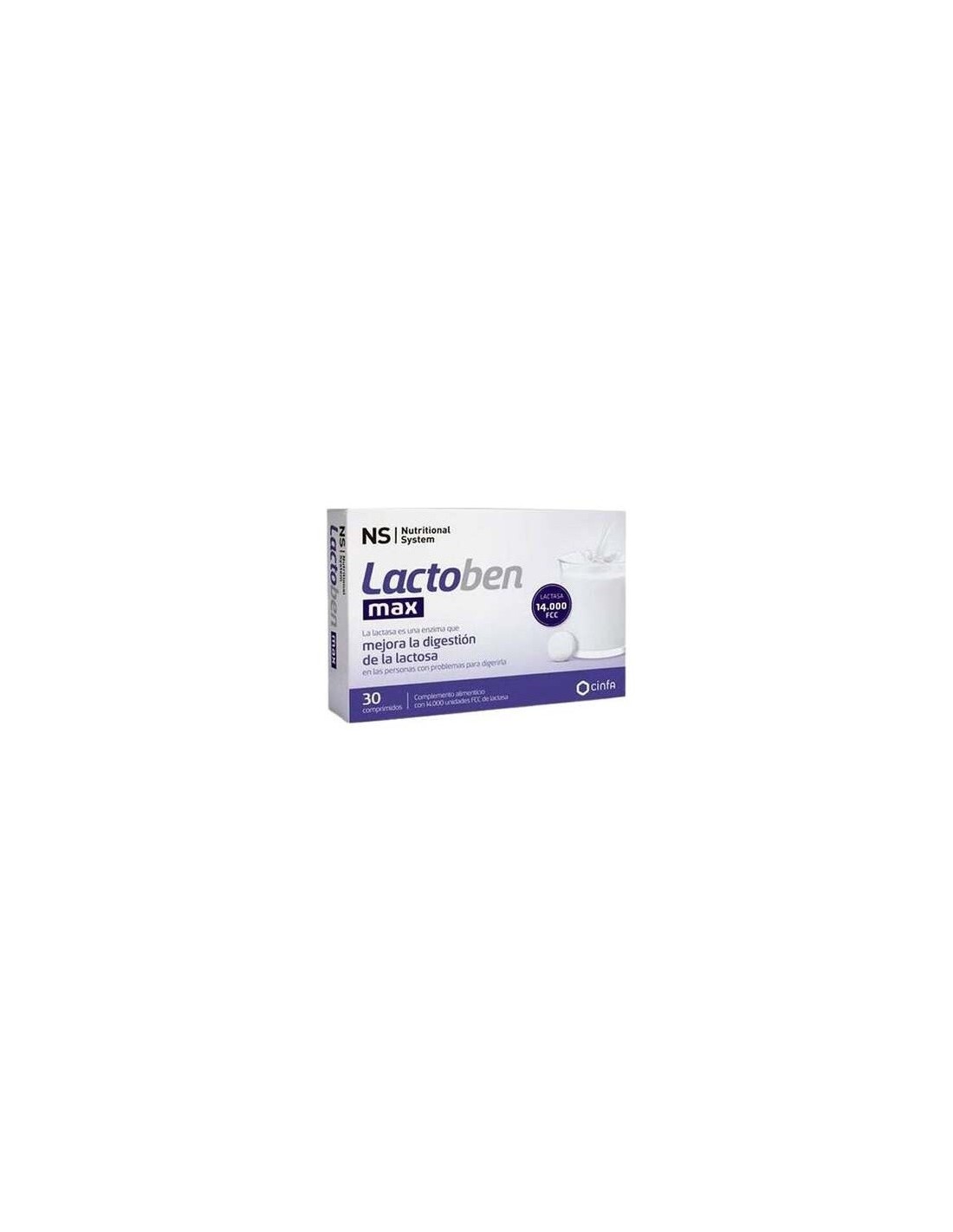 Lactoben Max de Ns Cinfa permite a los intolerantes a la lactosa comer alimentos con lactosa sin sufrir las molestias intestinales y gases que normalmente les provoca la lactosa. Gracias al alto contenido en enzima lactasa ( 14.00 FCC por dosis) un comprimido digiere 500 ml de leche. siendo útil para aquellas personas con altos niveles de intolerancia a la lactosa tras la ingesta de alimentos que la contengan.