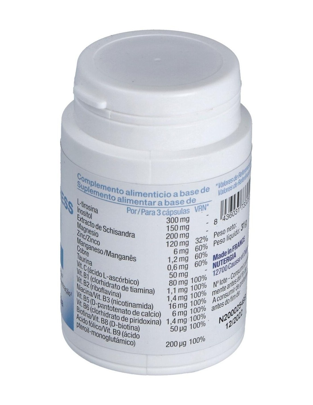 L-tirosina, magnesio marino (óxido de magnesio), antiaglomerantes: fosfato dicálcico y estearato de magnesio, inositol, extracto de bacopa (Bacopa monnieri