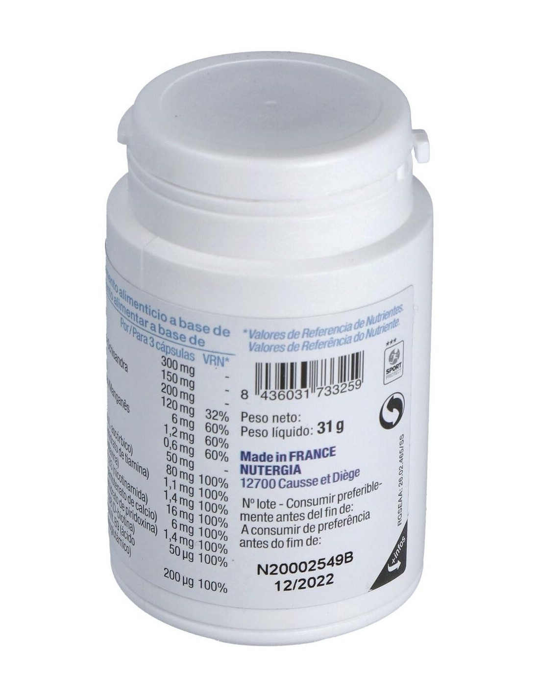 L.), vitamina C, gluconatos de zinc y cobre, taurina, vitaminas B1, B2, B3, B5, B6, B8 y B9 , sulfato de manganeso. Cápsula: gelatina de pescado, colorante : óxido de hierro.