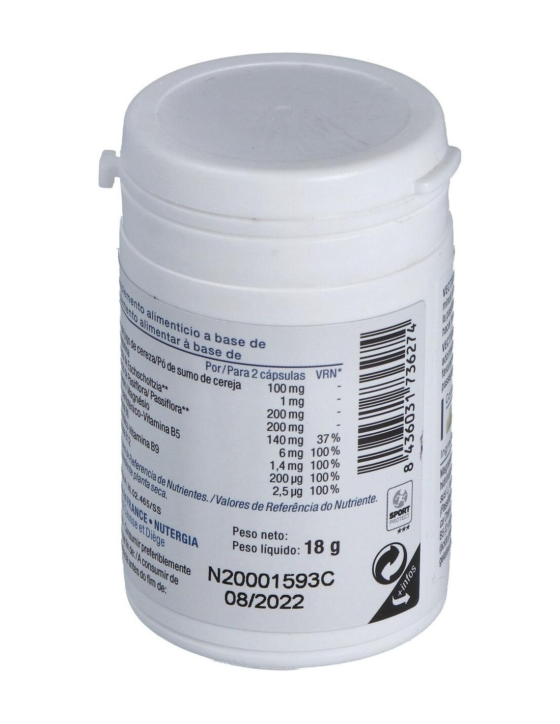 Ácido fólico (200 µg), Magnesio (100 mg), Extracto de pasiflora (100 mg), Polvo de eschscholtzia (100 mg), Ácido pantoténico (6 mg), Vitamina B12 (2.5 µg), Vitamina B6 (1.4 mg), Melatonina (1 mg), Magnesio marino, Lecitina de soja, Oxido de Hierro, Polvo de cereza, Gelatina de pescado, Fosfato dicálcico.