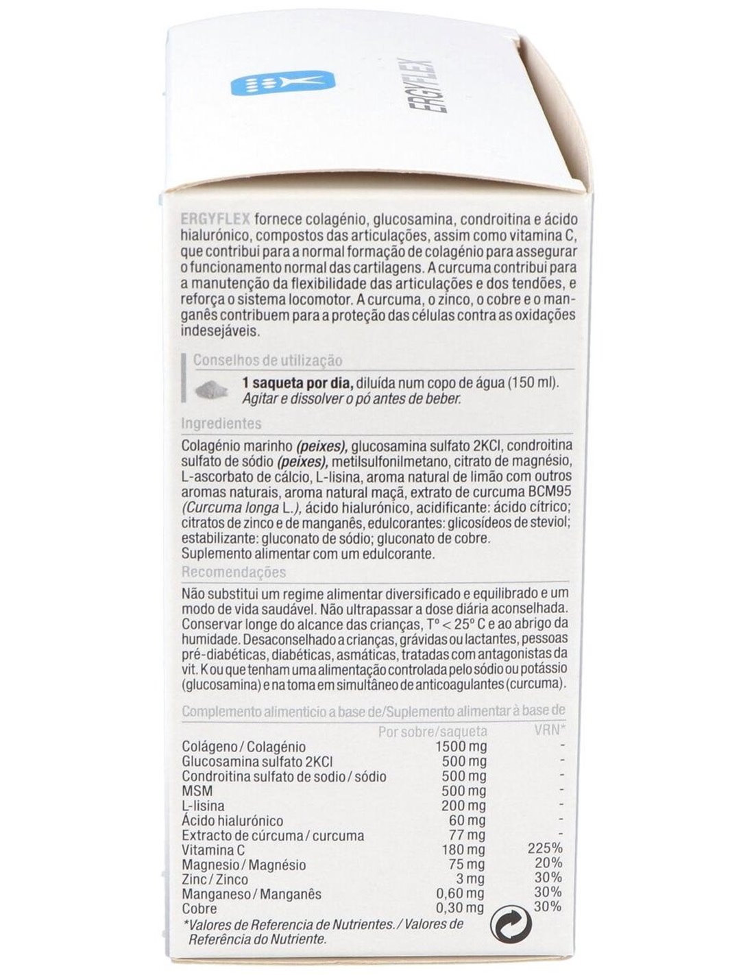 Colágeno marino hidrolizado (pescado), glucosamina sulfato 2KCl de origen vegetal, condroitina sulfato de sodio (pescado), metilsulfonilmetano, citrato de magnesio, L ascorbato de calcio, L-lisina, sabor natural de limón con otros sabores naturales, sabor natural de manzana, extracto de cúrcuma BCM-95® (Curcuma longa L.), ácido hialurónico, acidificante: ácido cítrico: citratos de zinc y de manganeso, edulcorante: glicósidos de steviol: estabilizante: gluconato de sodio: gluconato de cobre.