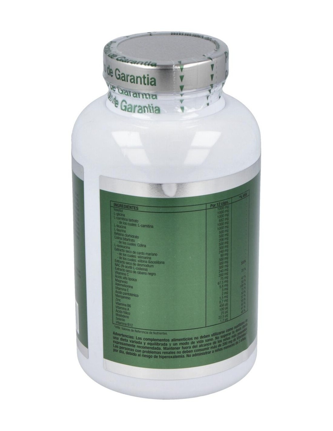 Hidroxipropilmetilcelulosa*, Inositol, L-Glicina, L-Carnitina Tartrato, L-Leucina, L-Taurina, Betaina, Colina, L-Isoleucina, Magnesio Citrato, Extracto Seco De Cardo Mariano, Extracto Seco De Desmodio, N-Acetil L-Cisteina, Extracto Seco De Rábano Negro, Goma Arábiga, Ácido L-Ascórbico, Ácido Alfa Lipoico, Same (S-Adenosyl-L-Metionina Disulfato P-Toluensulfonato), Estearato De Magnesio, Dióxido De Sílice, D-Alfa Tocoferol Acetato, Sulfato De Manganeso, Carbonato De Zinc, Pantotenato Cálcico, Retinol Acetato, Piridoxina, Ácido Fólico, Selenito Sódico, Amonio Molibdato, Cianocobalamina.