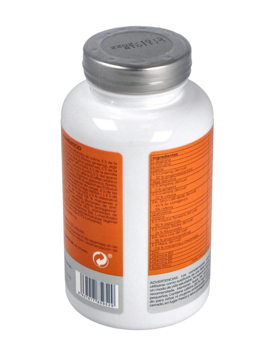 L-arginina, L-citrulina, bitartrato de colina, ext. seco de la raíz y hojas de ginseng coreano 30 % (UV) (Panax ginseng), alga spirulina en polvo 60 % de proteína (Spirulina platensis), ext. seco de la raíz de jengibre 5 % gingerol (Zingiber officinalis), ext. seco de la semilla de guaraná 22 % cafeína (Paullina cupana Kunth), ext. seco del grano de café verde 45 % ácido clorogénico y 5 % cafeína (Coffea arabica L.), quercetina 98 % (UV) y 95 % HPLC (Sophora japonica, flores), inosina, ext. seco del fruto de tribulus terrestris 90 % saponinas (Tribulus terrestris L.), celulosa microcristalina (agente de carga), ext. seco de las hojas de ginkgo biloba 24 % flavonoides (Ginkgo biloba L.), ext. seco de las semillas de uva 95 % proantocianidinas (UV) y 5 % resveratrol (Vitis vinífera L.), ext. seco de la raíz de maca 0,6% macaenos y macamidas 10:1 (Lepidium meyenii walp), gluconato de zinc, estearato de magnesio vegetal y dióxido de silicio (antiaglomerantes), metilcobalamina 0,1 % (vitamina B12), clorhidrato de piridoxina (vitamina B6), riboflavina (vitamina B2), L-metilfolato cálcico (ácido fólico), cápsula: hidroxipropilmetilcelulosa (agente de recubrimiento) y óxido de hierro rojo E-172 (colorante).