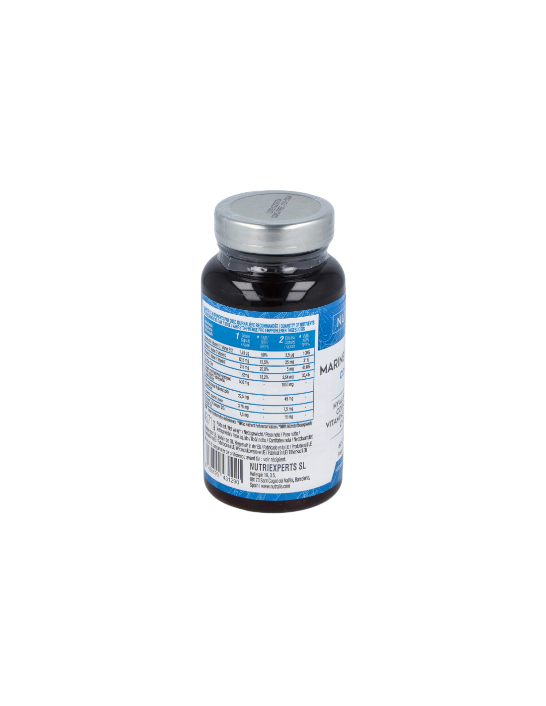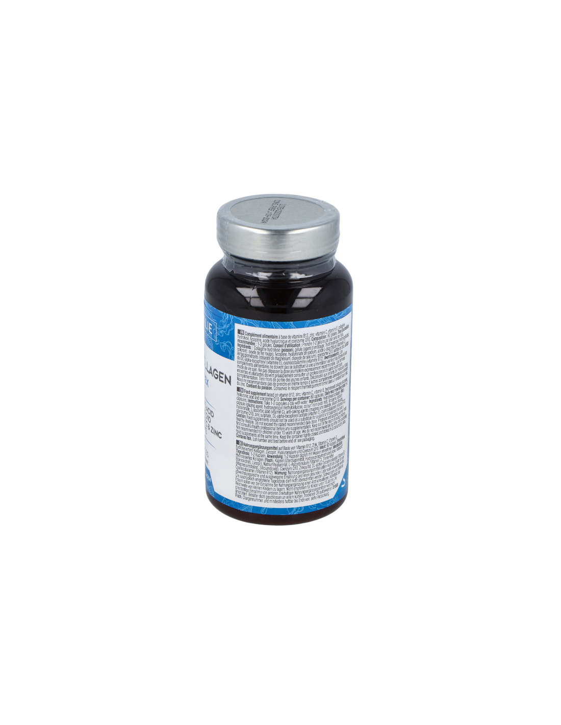 Colágeno hidrolizado (pescado), agente de recubrimiento (hidroxipropilmetilcelulosa), licopeno, hialuronato sódico, ácido L-ascórbico (vitamina C), antiaglomerantes (estearato de magnesio, dióxido de silicio), coenzima Q10, sulfato de zinc, acetato de D-alfa-tocoferilo (vitamina E), cianocobalamina (Vitamina b12).