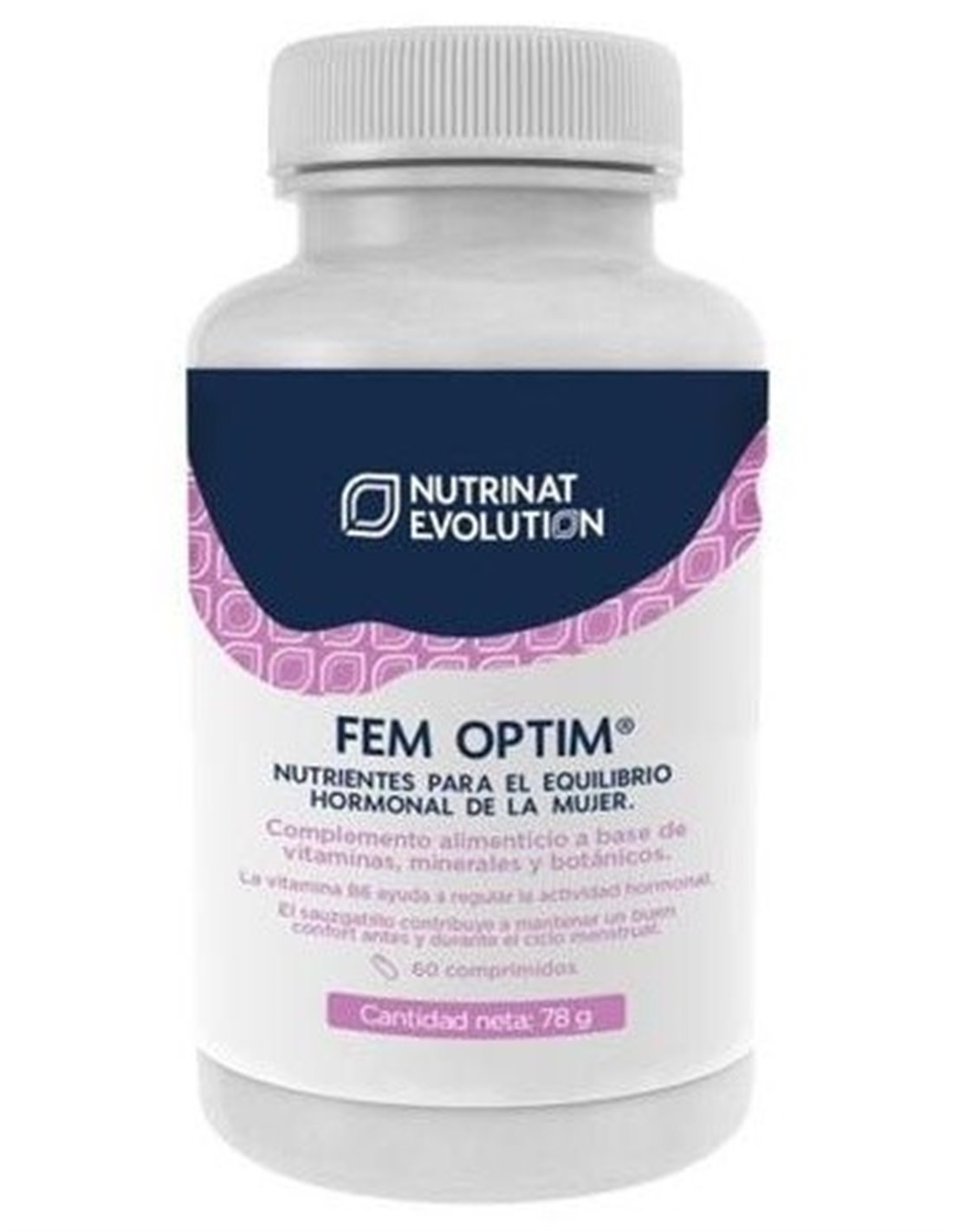 NUTRINAT EVOLUTIONFem Optim® es una combinación sinérgica de extractos estandarizados de plantas de alta calidad y micronutrientes, que actúa bajo la combinación de diferentes mecanismos en todo el espectro de síntomas del síndrome premenstrual. Además, incluye ciertas vitaminas y minerales como la vitamina C, y minerales como el zinc y hierro, ya que su aporte podría ayudar con dicho síndrome. La vitamina B6 contribuye a regular las hormonas. El magnesio ayuda a mantener el sistema nervioso en condiciones normales. Producto apto para veganos.