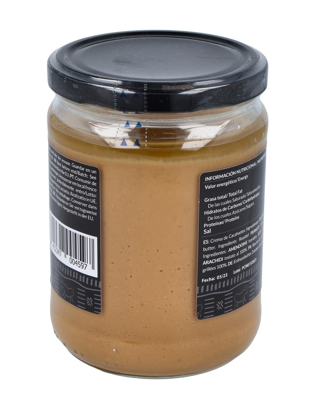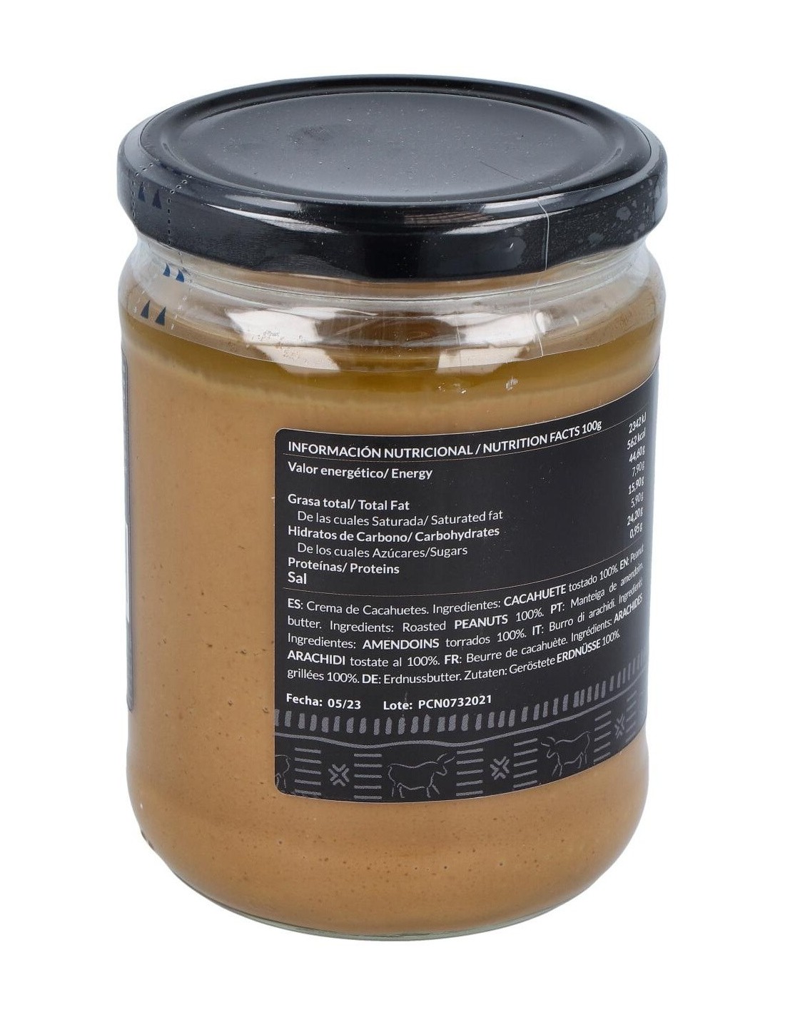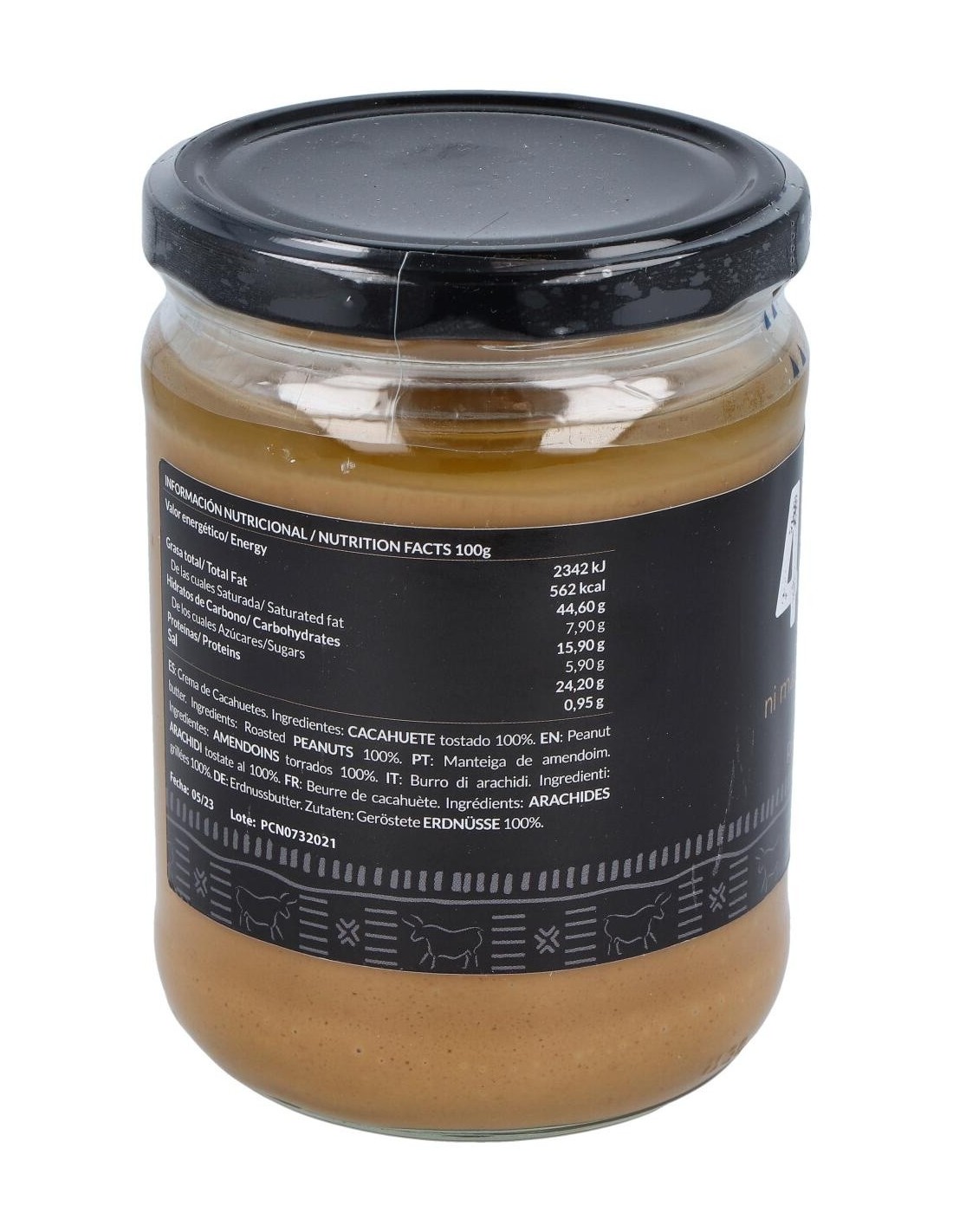 Resultado de tostar y triturar 457 cacahuetes en cada tarro. Sin aditivos artificiales, sin aceite de palma, sin azúcar y sin sal. Apta para la dieta vegana.