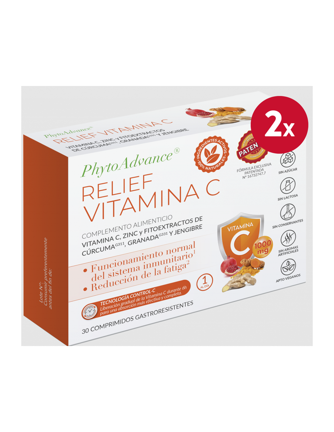 PHYTOADVANCE PACKPhytorelief® Vita C Melhora as defesas e aumenta a vitalidade e energia. Phytorelief® Vita C é um suplemento alimentar com Vitamina C (1000 mg), Zinco e fitoextratos de Cúrcuma, Romã e Gengibre que contribui para o normal funcionamento do sistema imunitário1 e para a redução da fadiga2. 1 A vitamina C e o zinco contribuem para o funcionamento normal do sistema imunitário. 2 A vitamina C ajuda a reduzir o cansaço e a fadiga e promove o metabolismo energético normal. 30 COMPRIMIDOS GASTRORESISTENTES Ingredientes Phytorelief® Vita C é um suplemento alimentar elaborado com 1000 mg de Vitamina C, Zinco e fitoextratos de Cúrcuma, Romã e Gengibre. 1 A vitamina C e o zinco contribuem para o funcionamento normal do sistema imunitário. 2 A vitamina C ajuda a reduzir o cansaço e a fadiga e promove o metabolismo energético normal. Complexos fitocêuticos próprios da Alchem International. ASPECTOS DIFERENCIAIS. Alta biodisponibilidade devido à sua absorção mais completa. Sem efeitos colaterais gástricos (comprimidos gastrorresistentes). Nossos fitoextratos são ingredientes ativos únicos, obtidos graças à exclusiva tecnologia alchemLife® PhytoAdvance®. Desta forma, sua pureza é otimizada para manter sua biodisponibilidade e todas as suas propriedades. SEM GLÚTEN, SEM AÇÚCAR, SEM LACTOSE, SEM CONSERVANTES, SEM AROMAS ARTIFICIAIS, INDICADO PARA VEGANOS * Não exceder a dose diária recomendada. Os suplementos alimentares não devem ser utilizados como substitutos de uma dieta variada e equilibrada e de um estilo de vida saudável. TECNOLOGIA CONTROL-C Ao contrário de outras Vitaminas C, PHYTORELIEF® VITA C, possui uma Tecnologia exclusiva de liberação gradual durante 6 horas, que torna a Vitamina C, uma vez ingerida, resistente ao ácido estomacal e não é liberada até sua chegada no intestino (quando o pH é mais alto): a vitamina C é liberada progressivamente sem gerar saturação dos transportadores intestinais, conseguindo assim a eficácia máxima da dose. Desta forma consegue-se: Maior % de absorção total da Vitamina C (sem perdas nas fezes/urina). Evite distúrbios gástricos (azia). MODO DE UTILIZAÇÃO Tomar 1 comprimido por dia, de preferência fora das refeições, com um copo de água. Tome o comprimido inteiro, sem dividi-lo. PHYTORELIEF® Vita C pode ser tomado durante todo o ano e é especialmente recomendado para mudanças sazonais (neste caso, recomenda-se tomar PHYTORELIEF® Vita C por 2 meses, em dois lotes: setembro-outubro e fevereiro-março).