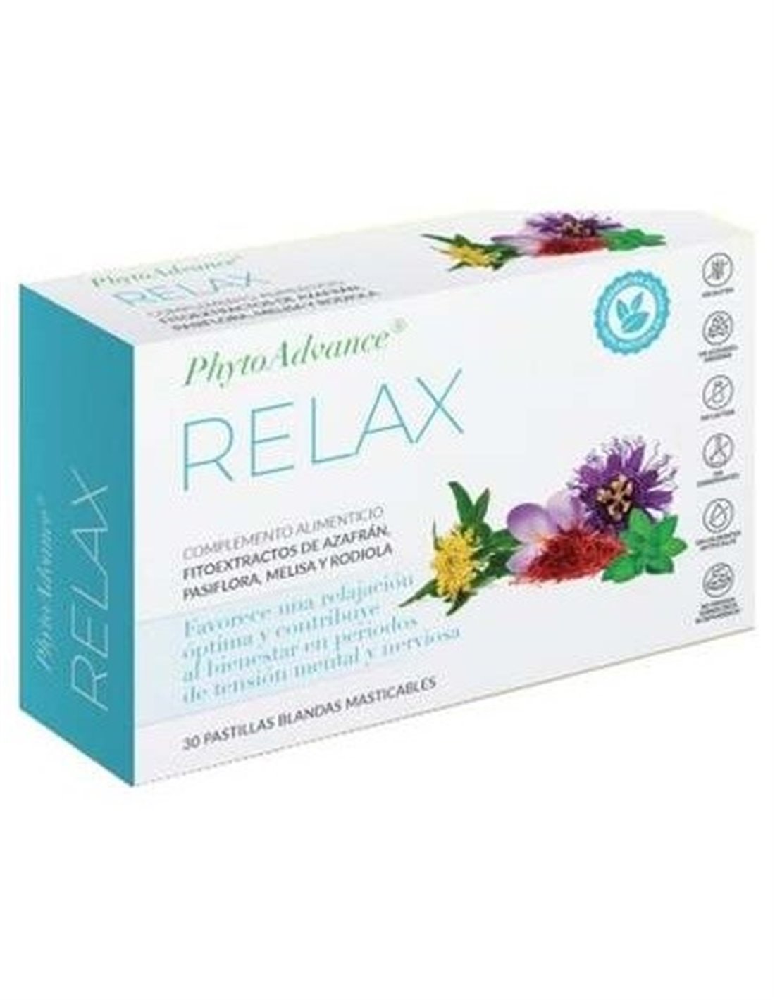 PHYTOADVANCEComplemento alimenticio con fitoextractos de Azafrán, Pasiflora, Melisa y Rodiola en forma de pastillas blandas masticables para una absorción inmediata, que\ apoyan la relajación y contribuyen al bienestar mental y físico en periodos de tensión mental y nerviosa. Alta biodisponibilidad debido a su absorción inmediata en la mucosa bucal. Sin efectos secundarios reportados.
