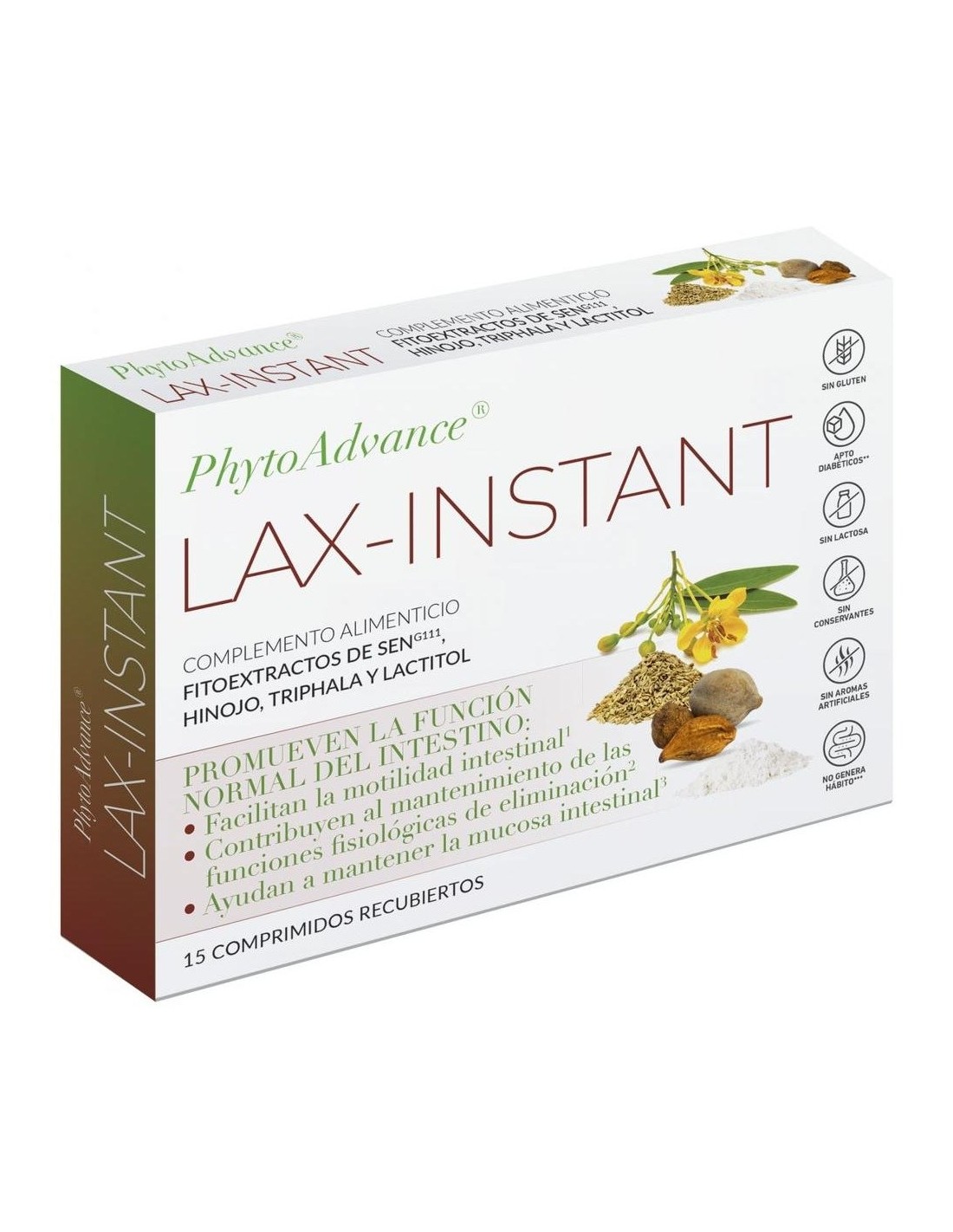PHYTOADVANCEComplemento alimenticio con Lactitol y fitoextractos de Sen, Hinojo y Triphala que promueven la función normal del intestino y facilitan la evacuación rápida. Recomendado para cambios en la rutina: viajes o cambios de dieta, estrés o estados de ansiedad, en dieta baja en fibra o hidratación insuficiente, inactividad física, en personas que evitan ir al baño cuando sienten la necesidad o durante los cambios hormonales en mujeres durante el ciclo pre-menstrual.