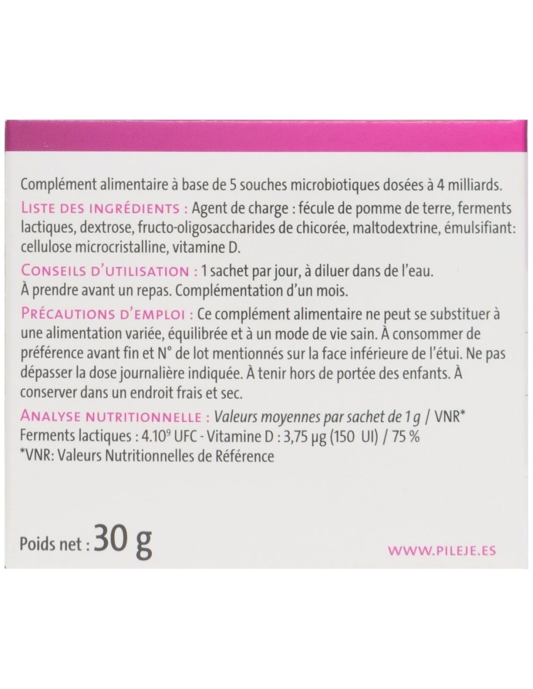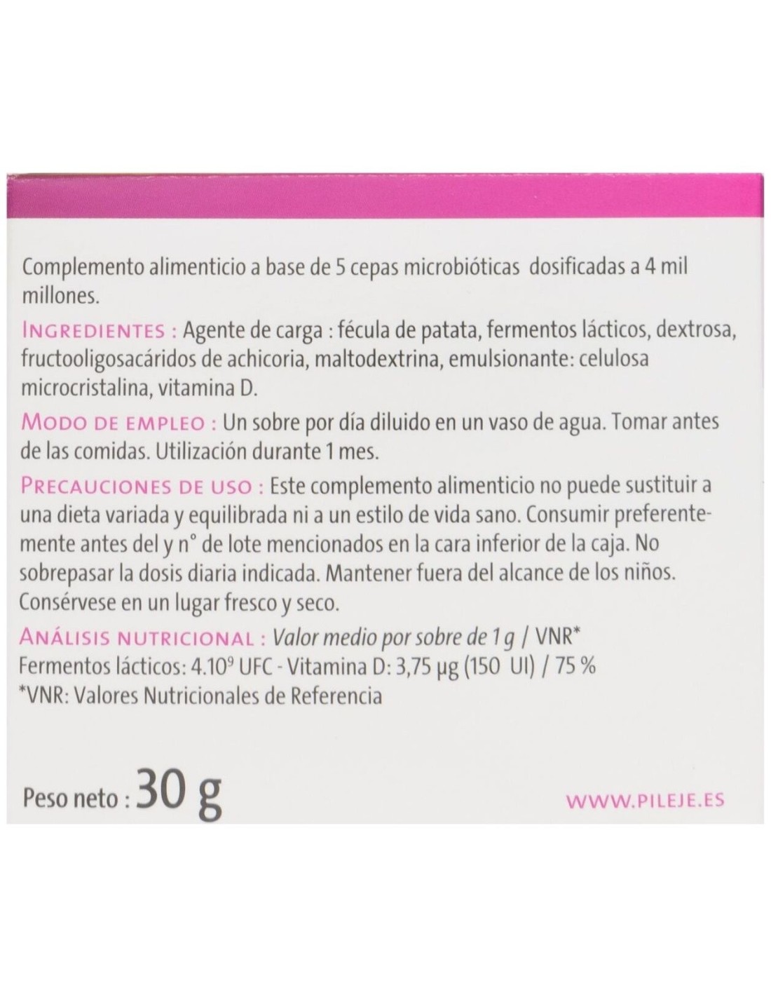 Agente de carga: fécula de patata, fermentos lácticos, dextrosa, fructooligosacáridos de achicoria, maltodextrina, soporte: celulosa, vitamina D.