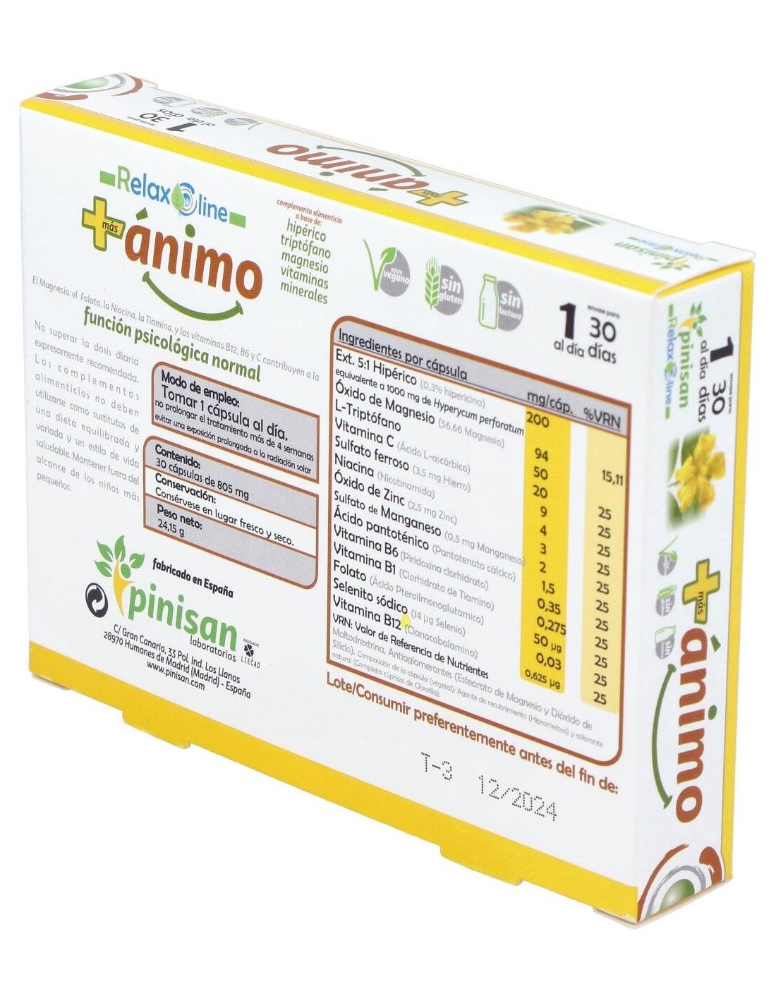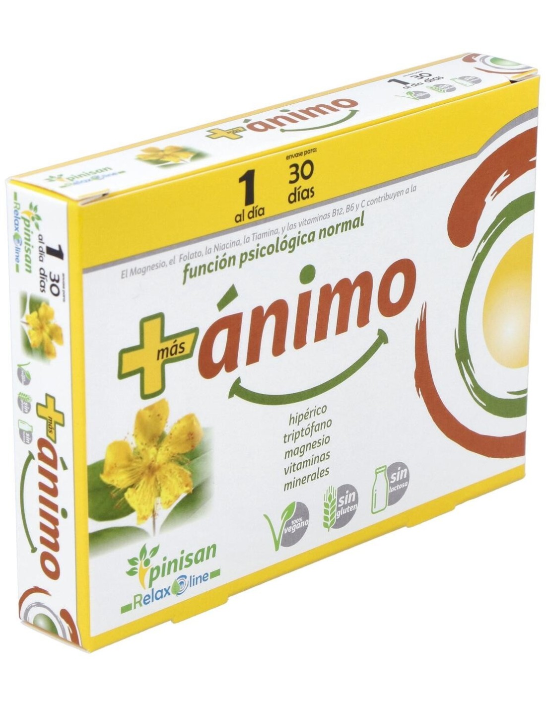 Pinisan Más Ánimo es un complemento alimenticio que contribuye a la mejora del estado de ánimo gracias a su fórmula con hipérico, triptófano, vitaminas (principalmente del grupo B) y magnesio. También contribuye al funcionamiento psicológico normal.