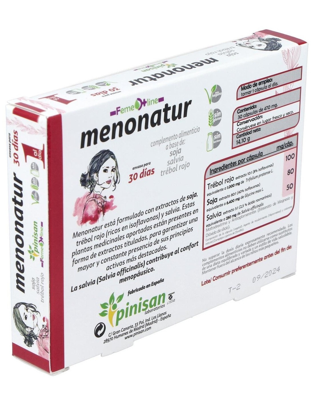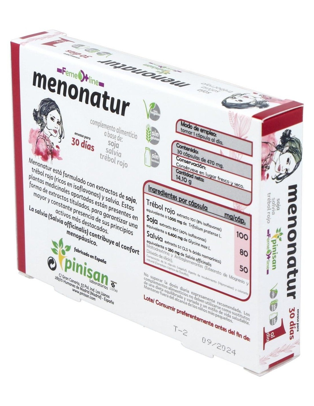 Pinisan Menonatur es un complemento alimenticio que ayuda a aliviar los síntomas de la menopausia y contribuye al bienestar de la mujer durante este periodo. Aporta isoflavonas de soja con efecto 24 horas, además de salvia y trébol rojo.