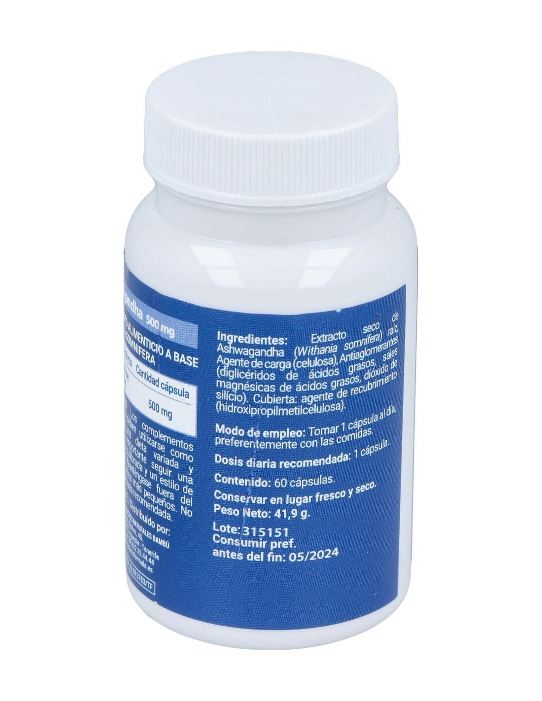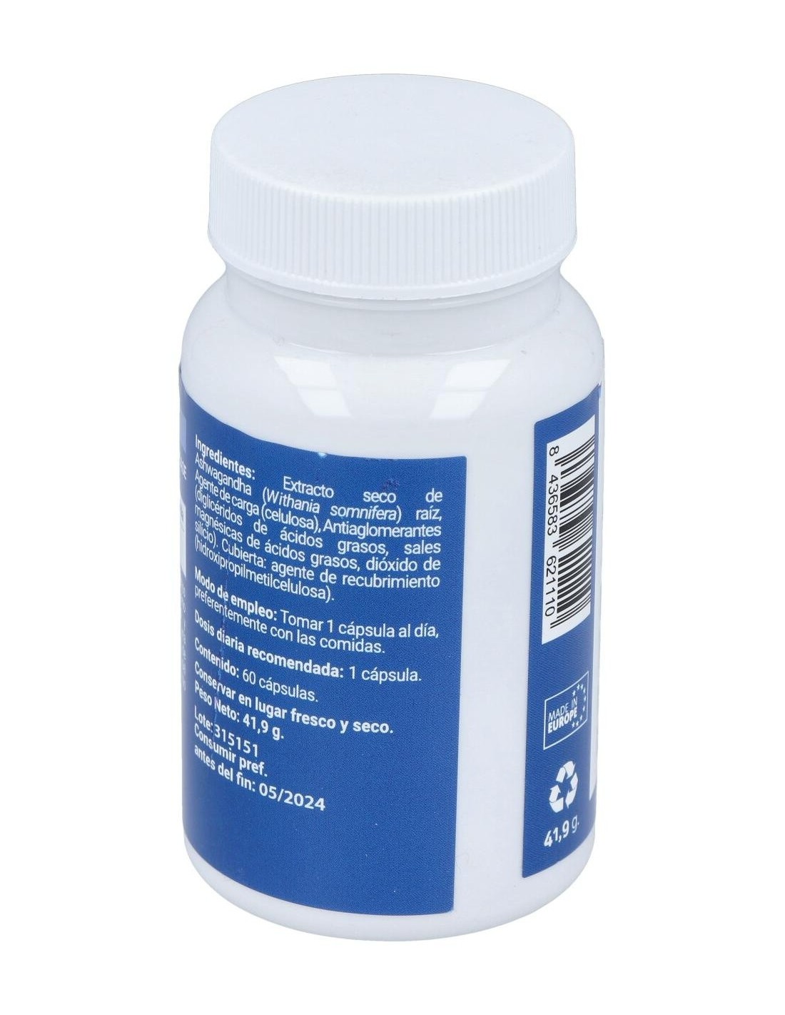Extracto seco de ashwagandha (withania somnifera) raíz, agente de carga (celulosa), antiaglomerantes (diglicéridos de ácidos grasos, sales magnésicas de ácidos grasos, dióxido de silicio), cubierta: agente de recubrimiento(hidroxipropilmetilcelulosa)