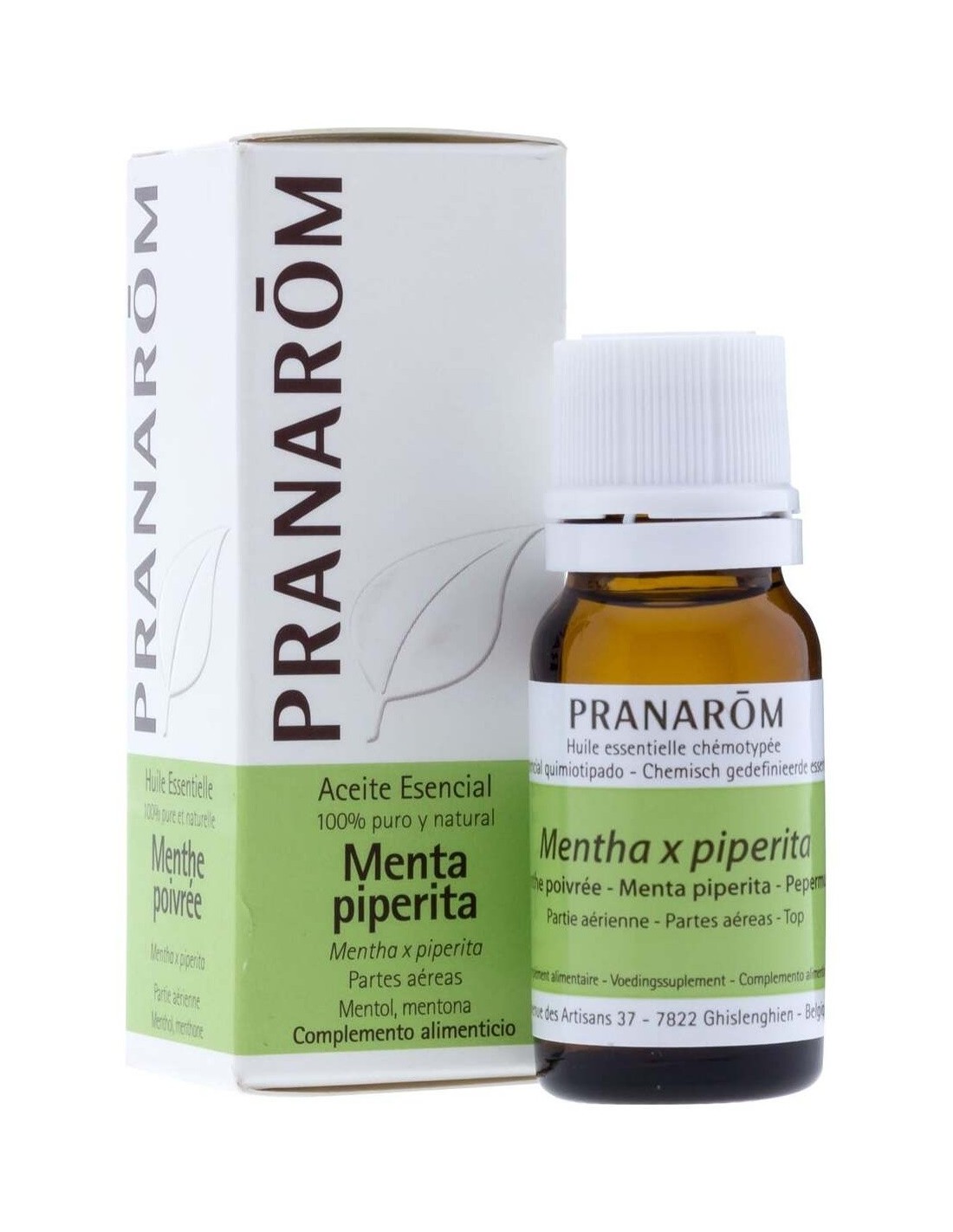 El aceite esencial de menta (Mentha piperita) es tonificante. Su efecto antiespasmódico calma las indigestiones y las nauseas, así como los mareos causados por los viajes. Gracias a su efecto analgésico, este aceite es un soporte en el caso de dolor por traumatismo, tendinitis, ciática, reumatismo, cefalea o neuralgia. Asimismo, tiene un efecto refrescante. También tiene propiedades antisépticas.