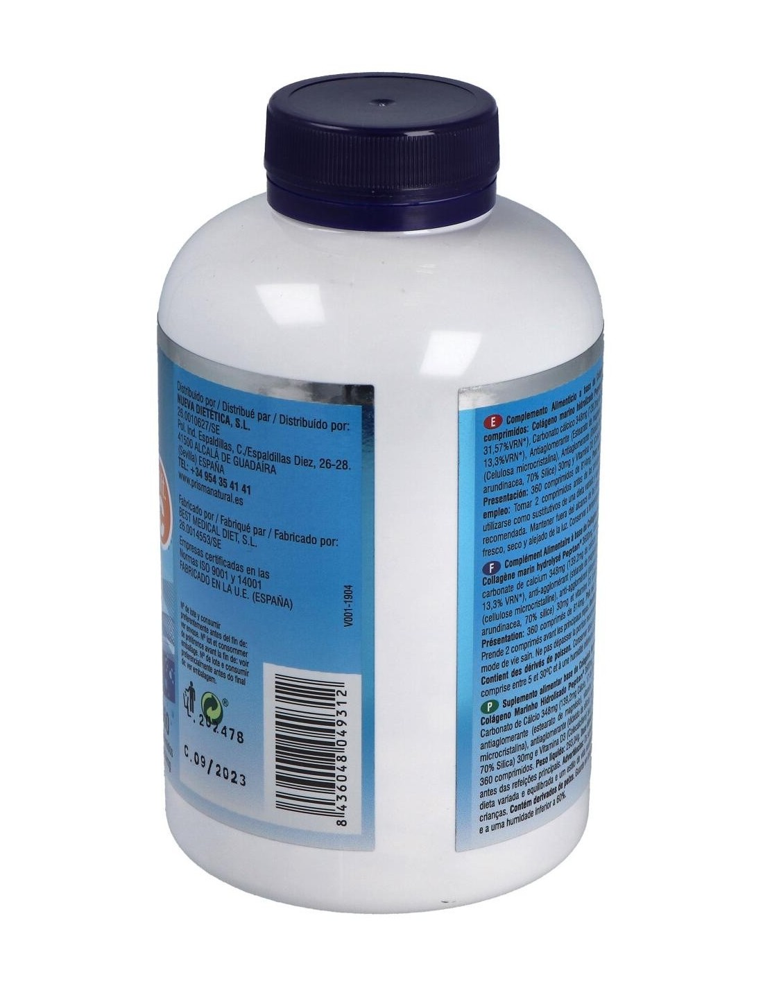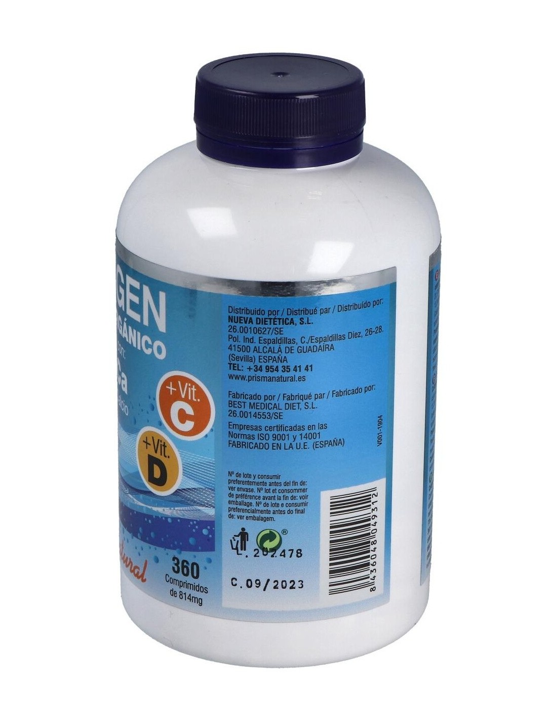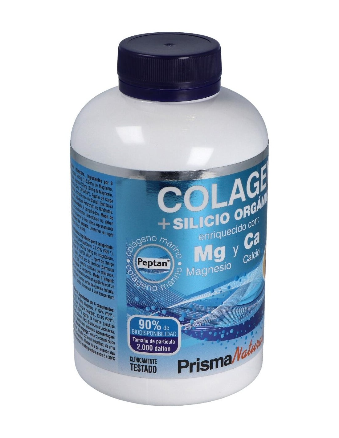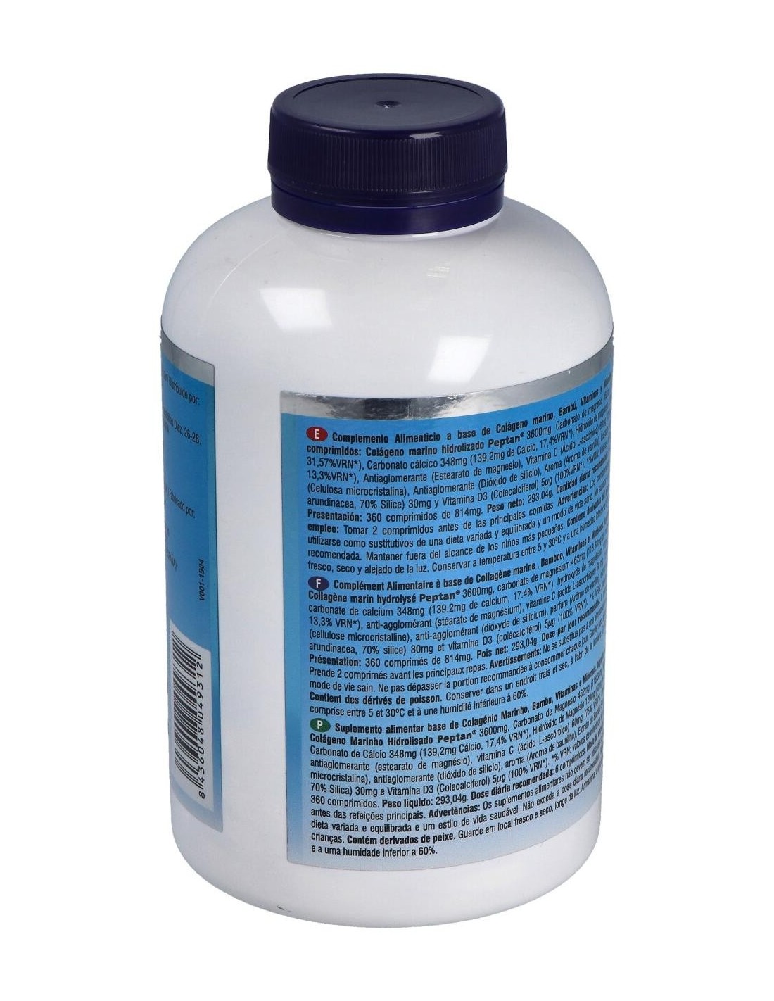Colágeno marino hidrolizado 3600 mg, Carbonato de magnesio 462 mg (118,38 mg de Magnesio), Carbonato cálcico 348 mg (139,2 mg de Calcio), Hidróxido de magnesio 120 mg (72 mg de Magnesio), Agente de carga (Celulosa microcristalina), Antiaglomerantes (Estearato de magnesio y Dióxido de silicio), Vitamina C (Ácido l-ascórbico) 60 mg, Bambú (Bambusa arundinacea Retz (Willd.), 70% Silicio) 30 mg y Vitamina D (Colecalciferol) 5 µg.