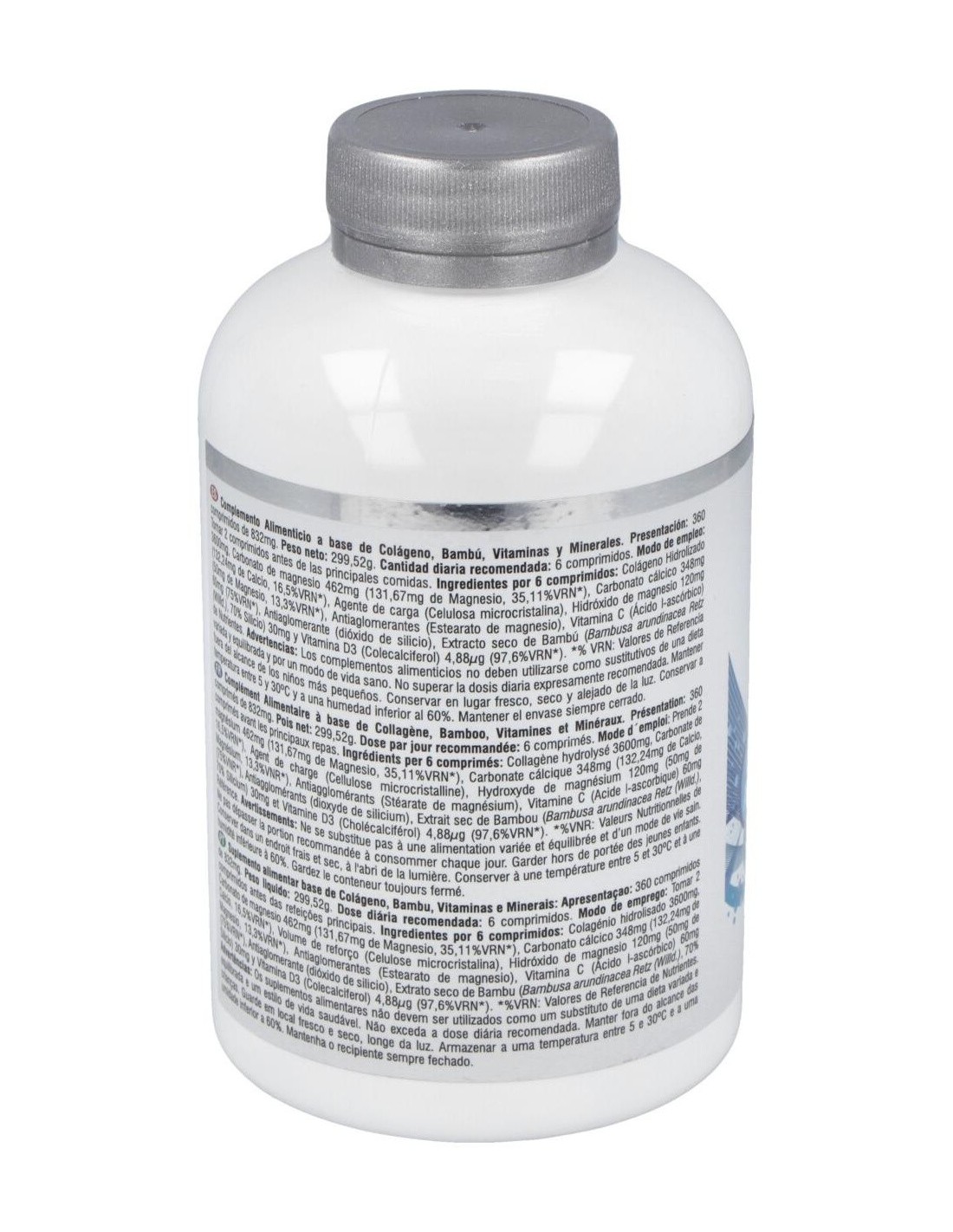 Ingredientes por 6 comprimidos: Colágeno marino hidrolizado 3600mg, Carbonato de magnesio 462mg (118,38mg de Magnesio, 31,57%VRN), Carbonato cálcico 348mg (139,2mg de Calcio, 17,4%VRN), Hidróxido de magnesio 120mg (72mg de Magnesio, 19,2%VRN), Agente de carga (Celulosa microcristalina), Antiaglomerantes (Estearato de magnesio y Dióxido de silicio), Vitamina C (Ácido l-ascórbico) 60mg (75%VRN), Bambú (Bambusa arundinacea Retz (Willd.), 70% Silicio) 30mg y Vitamina D (Colecalciferol) 5µg (100%VRN).