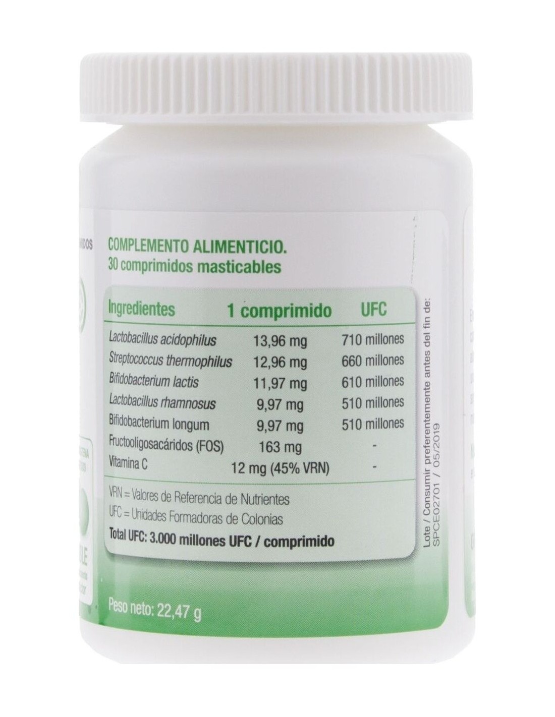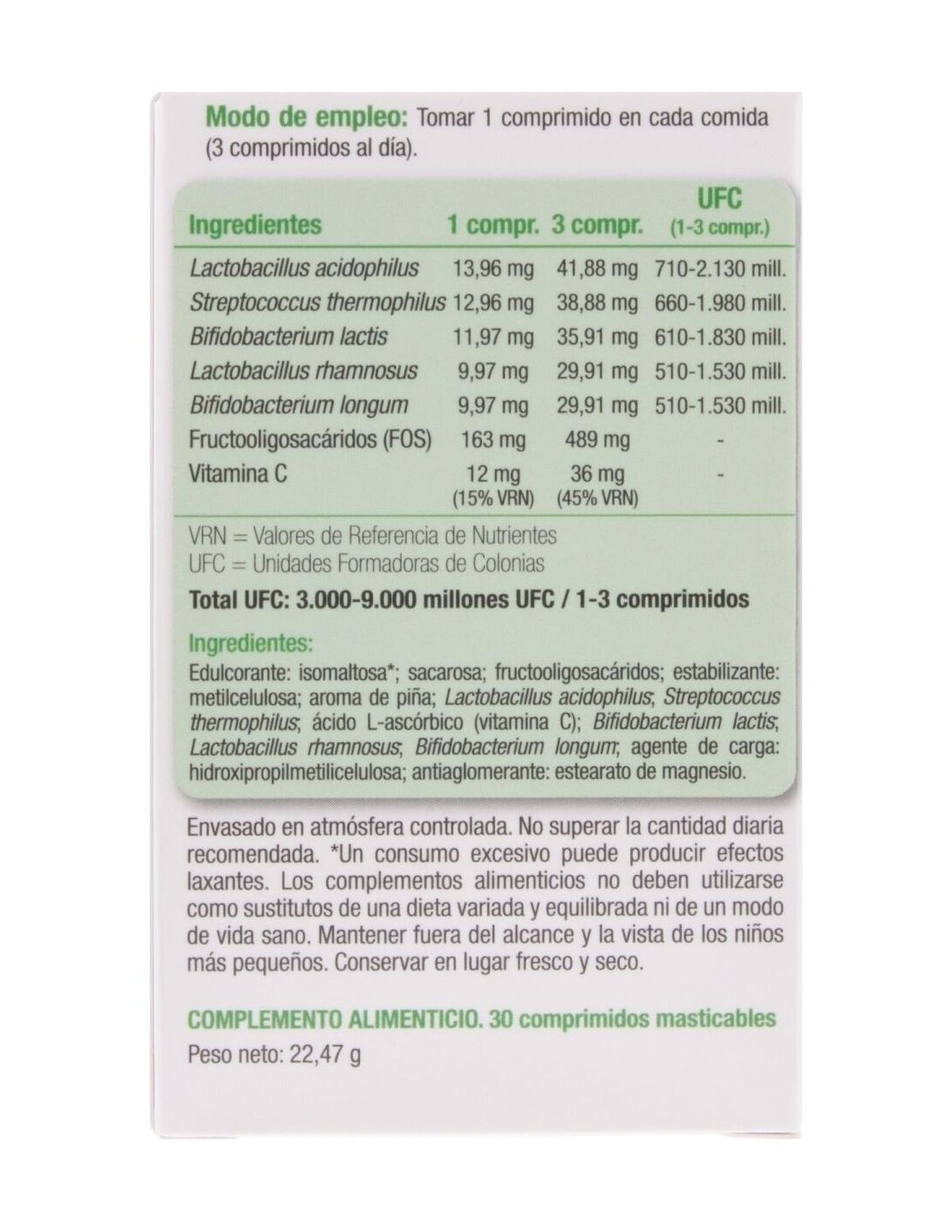 LACTOBACILLUS ACIDOPHILUS, STREPTOCOCCUS THERMOPHILUS, BIFIDOBACTERIUM LACTIS, LACTOBACILLUS RHAMNOSUS, BIFIDOBACTERIUM LONGUM, FRUCTOOLIGOSACÁRIDOS (FOS), VITAMINA C
