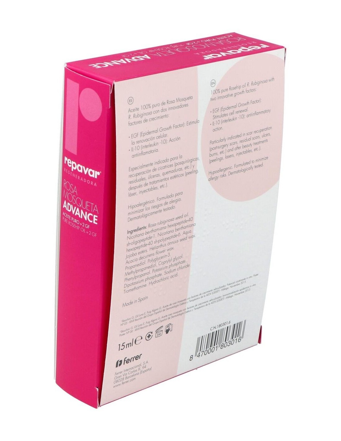 El aceite de rosa mosqueta Advance de Repavar es un aceite con propiedades cicatrizantes y antiinflamatorias que luchan contra las imperfecciones de la piel (arrugas, manchas, estrías, celulitis, úlceras, quemaduras...). Con Repavar podrás atenuar todas estas imperfecciones, al mismo tiempo que hidratas y le devuelves la elasticidad a la piel. Contiene un alto poder regenerante gracias a sus principios activos que mejoran la cicatrización y restauran la piel desde el interior. Es eficaz, también, para aliviar la piel sometida a tratamientos estéticos como peeling, láser o inyectables.