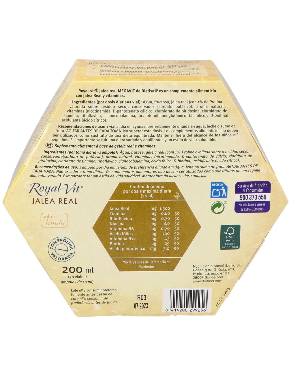 FRUCTOSA, AGUA, JALEA REAL, NICOTINAMIDA, D-PANTOTENATO CÁLCICO, CLORHIDRATO DE PIRIDOXINA, CLORHIDRATO DE TIAMINA, RIBOFLAVINA, CIANOCOBALAMINA, ÁCIDO FÓLICO, D-BIOTINA, ÁCIDO CÍTRICO, SORBATO POTÁSICO Y AROMA DE LIMÓN.