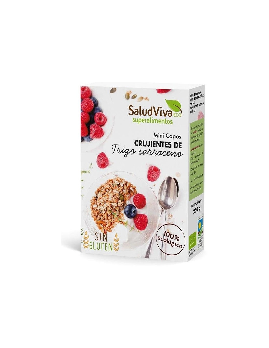 SALUD VIVADeliciosos copos mini crujientes de Trigo Sarraceno Integral. Sin sabores artificiales, colorantes o conservantes, y libres de gluten. Fuente de fibras y proteínas, bajo contenido de azúcar.