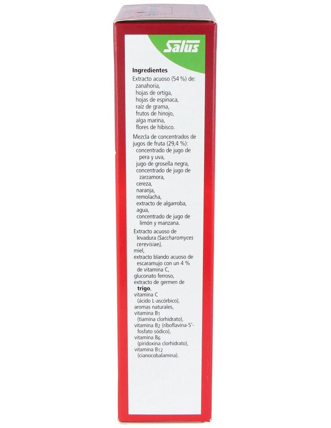 CIANOCOBALAMINA (VIT. B12). ÁCIDO ASCÓRBICO (VIT. C). ESPINACA (SPINACIA OLERACEA). TIAMINA CHLORHIDRATO (VIT. B1). RIBOFLAVINA (VT. B2). PIRIDOXINA (VIT. B6). ALGARROBO (CERATONIA SILIQUA) (A). GRAMA (CYNODON DACTYLON) (A). GROSELLERO NEGRO (RIBES NIGRUM) (A). HIBISCO (HIBISCUS SABDARIFFA) (A). LIMÓN (CITRUS LIMONUM) (A). ZANAHORIA (DAUCUS CAROTA) (A). CEREZA (PRUNUS CERASUS). NARANJA DULCE SERENZO (CITRUS SINENSIS). REMOLACHA (RAIZ DE BETA VULGARIS). ESCARAMUJO (FRUTO ROSA SILVESTRE). GERMEN DE TRIGO (TRITICUM VULGARE). ALGAS (CHLORELLA). LEVADURA. UVAS (FRUTO VITIS VINISFERA). PERAL (PRYRUS SSP). E579 GLUCONATO FERROSO. MIEL DE AZAHAR.