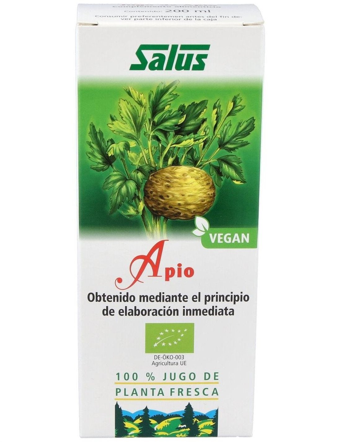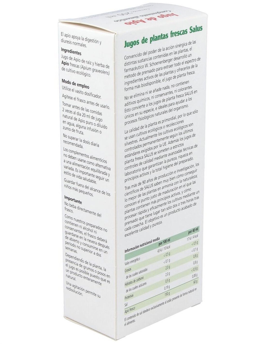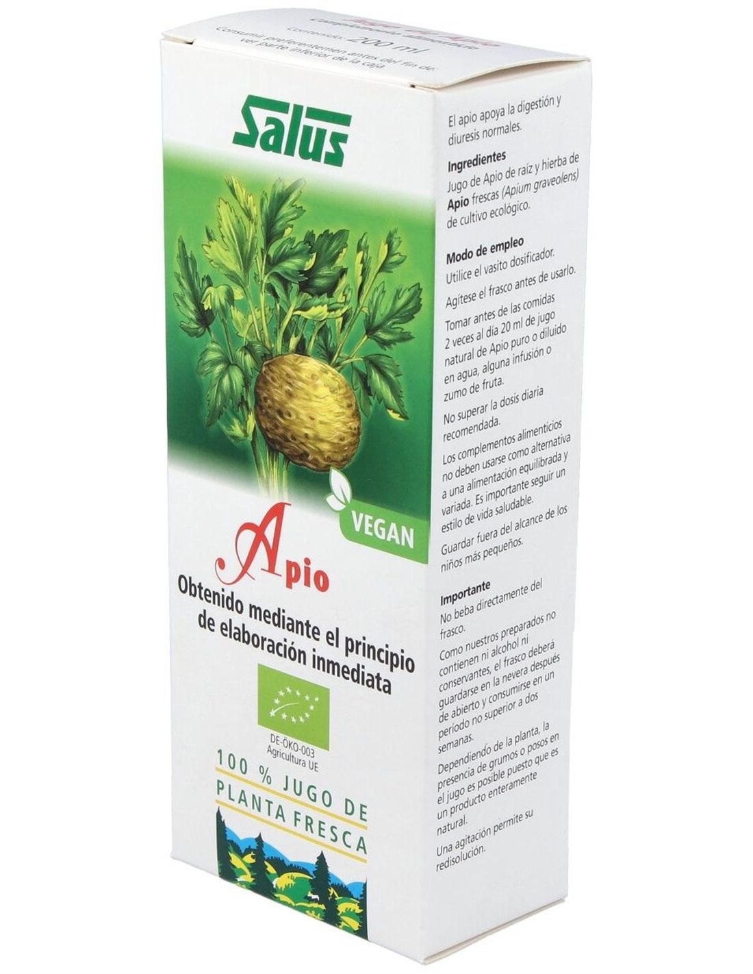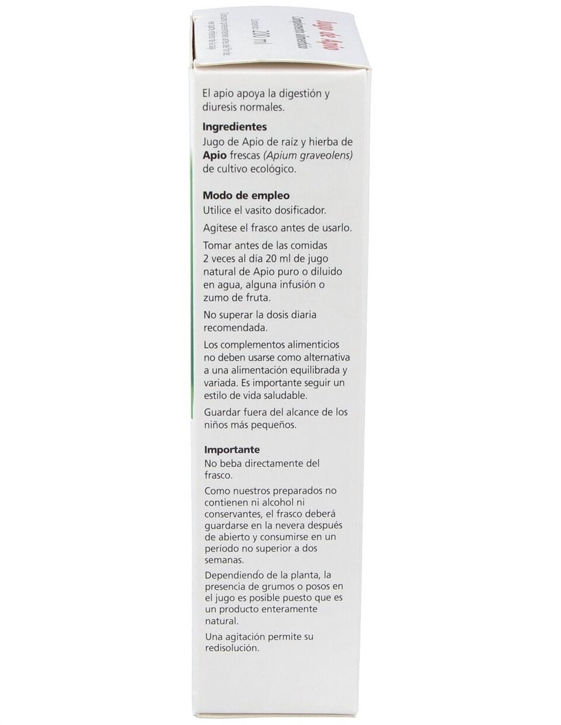 El jugo de apio se obtiene por prensado de la planta fresca en su óptimo punto de maduración, por lo que ofrece el espectro completo de principios tal y como se encuentran en la planta fresca, sin alteración alguna. Tiene propiedades diuréticas y digestivas.