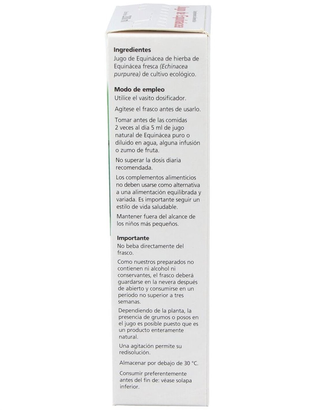 Jugo de equinácea procedente de cultivo ecológico, que refuerza las defensas del organismo. Apto para vegetarianos y veganos. Sin gluten y sin lactosa. No indicado durante el embarazo y la lactancia. No superar la dosis diaria recomendada. Los complementos alimenticios no son sustitutivos de una dieta sana y equilibrada ni de un estilo de vida saludable.