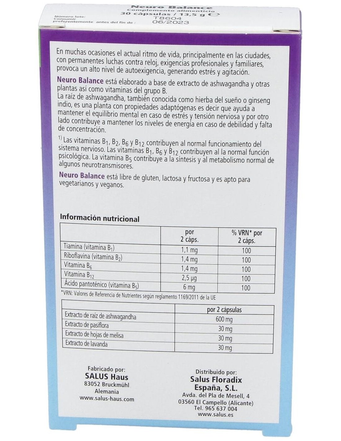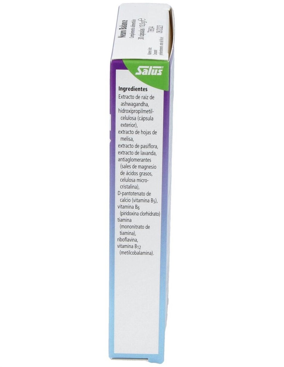 Extracto de raíz de ashwagandha, extracto de hojas de melisa, extracto de pasiflora, extracto de lavanda, D-pantotenato de calcio (vitamina B5), piridoxina clorhidrato