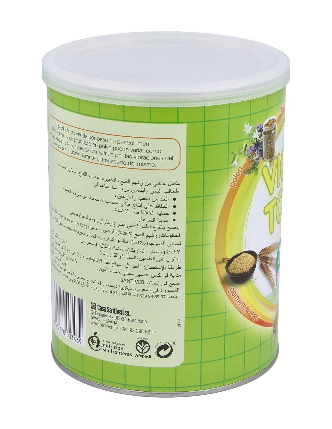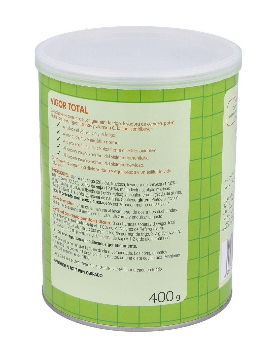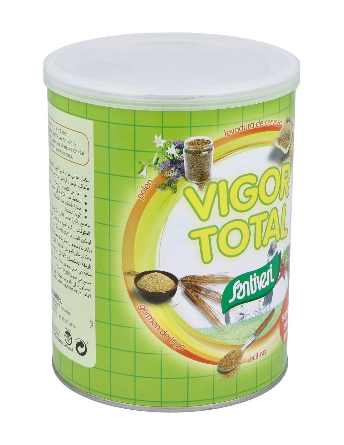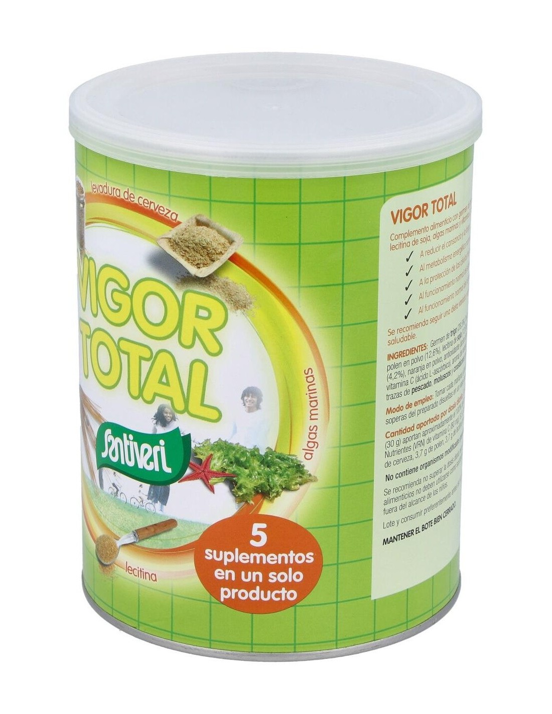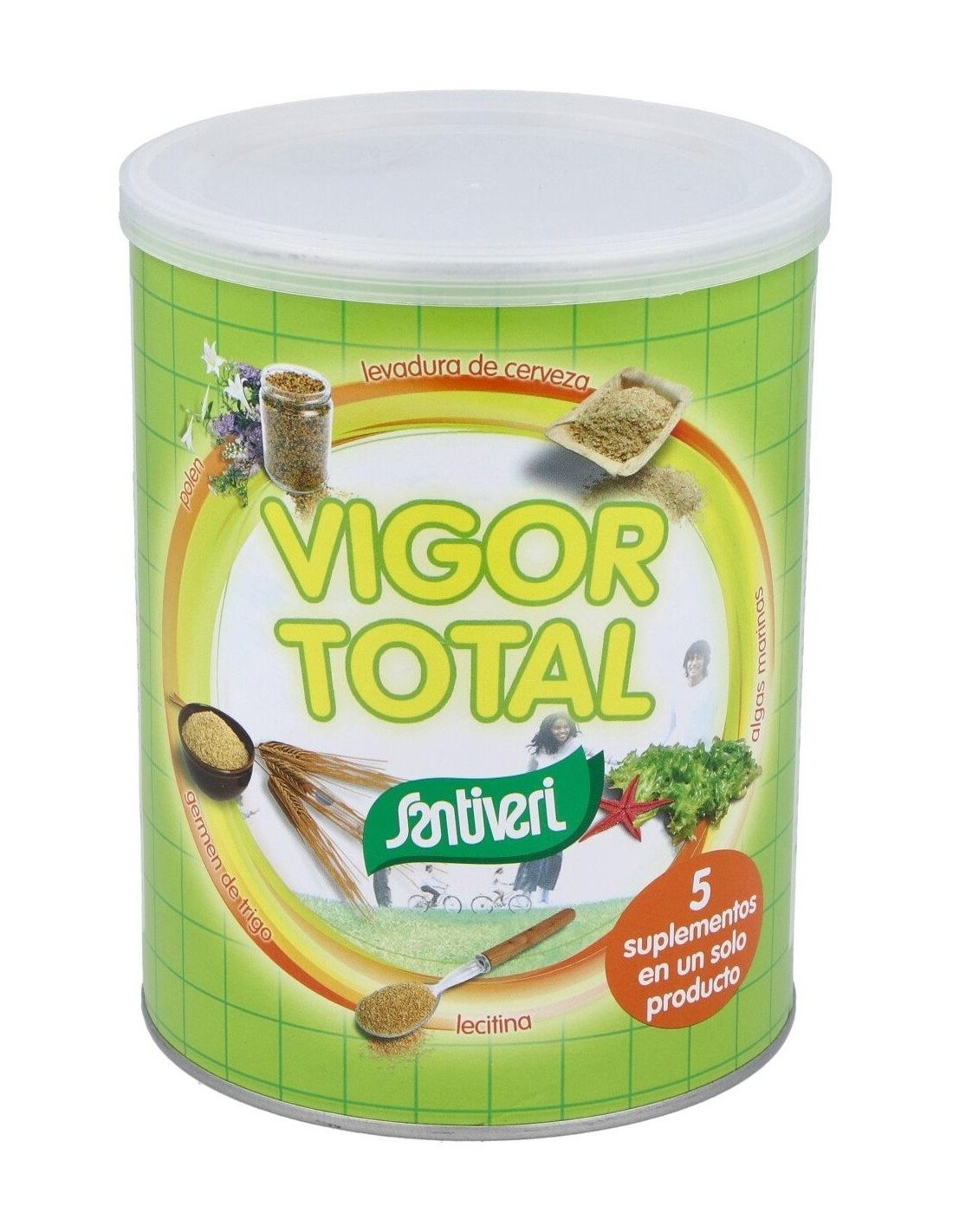 Santiveri Vigor Total + 400g es un suplemento alimenticio a base de levadura de cerveza, polem, germen de trigo, maca, lectina de soja, vitamina C y algas kelp. Ayuda a energizar el cuerpo.